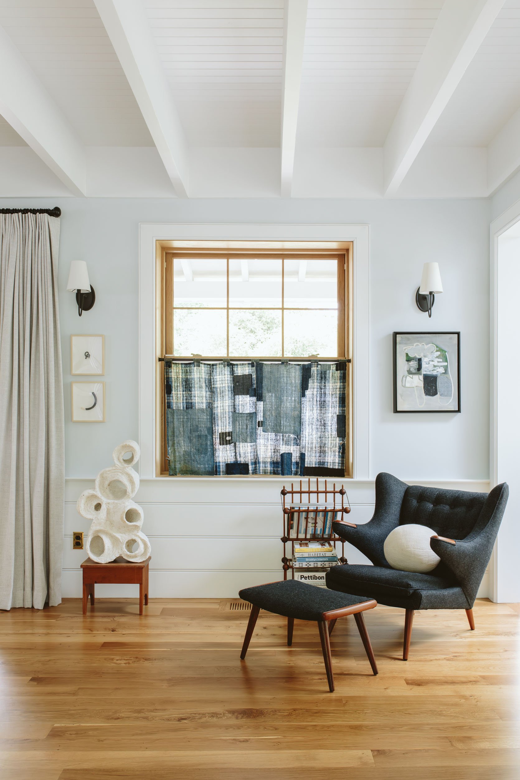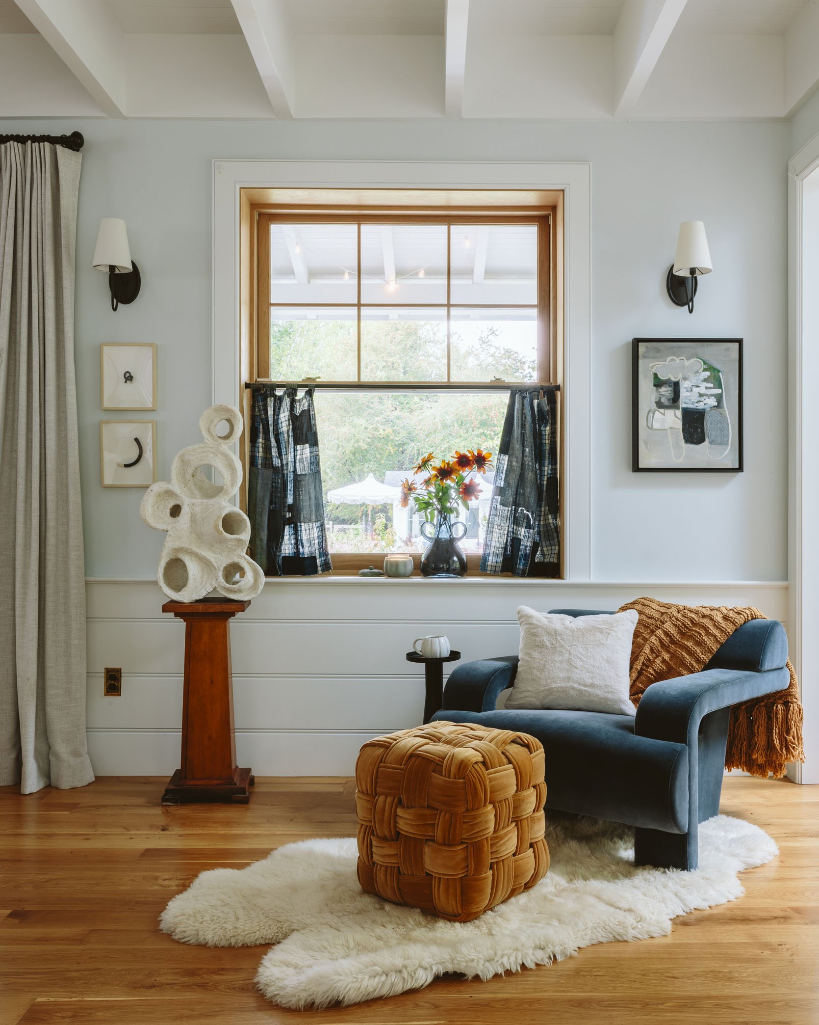 Ok, so at first the chaise lounge didn’t make it in (not sure why). We were still figuring out how to flow through the house. I put this papa bear chair and ottoman here. It looks really cold now (this corner is so hard to shoot – the light is just so dead).