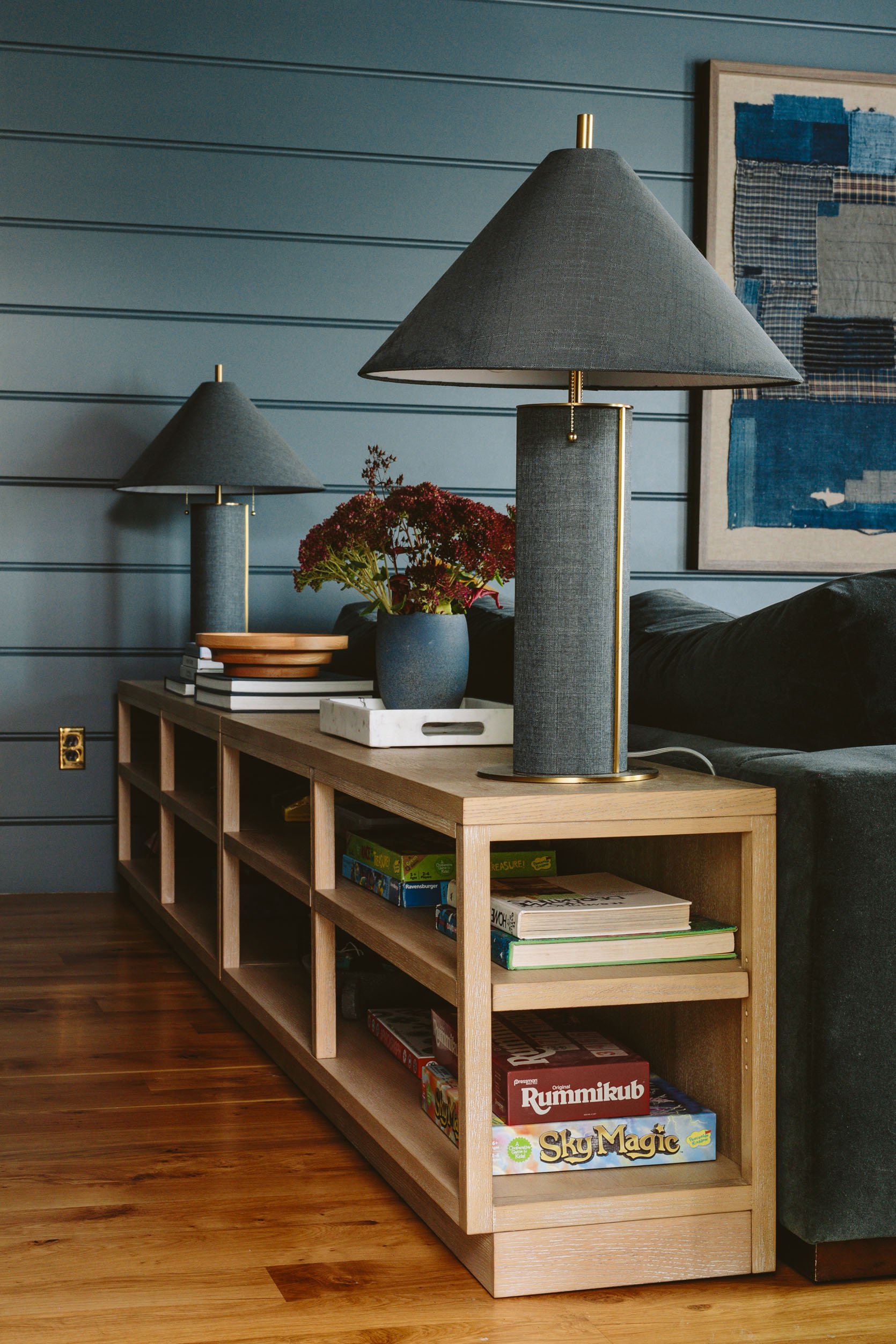So these bookshelves actually moved UP a spot from last year! They are awesome so this feels right:) Here’s what was said last year: “‘Since the sofa is slammed up against the far wall and there was hardly any room for a side table on this side of it, we needed a sofa table,’ Em explains. ‘Enter this bookcase from Pottery Barn that fits PERFECTLY along the back of the sofa and is where my wine or tea sits when I’m watching TV (as well as those gorgeous lamps). It looks fully integrated and almost like it was professionally designed!’ (Confession: I’m eyeing the same bookcases to pair with my new sectional!)”
