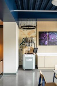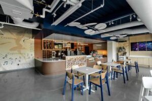 As the general contractor, Swinerton was responsible for overseeing modifications to the existing mechanical systems and the installation of new plumbing, drain lines and ceiling needed to support commercial-grade kitchen equipment and self-service refrigerators. Custom millwork was also completed throughout the 1,100-square-foot space. Swinerton’s self-perform team built a furring wall and installed ceiling tiles along with a baffled light fixture that enhances overall acoustics and aesthetics. The team also framed the space and installed drywall. Designed by SCOPOS Hospitality Group in partnership with Interior Architects, the café opened this summer.