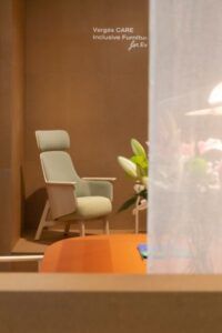 “If we want to create truly healing and healthy spaces, they need to be kind, to feel like home. That is why we want the new Care collection upholsteries to convey warmth, comfort, and sustainability: removable, comfortable, and washable fabrics that feel much more pleasant. The furniture is also designed without sharp edges and can incorporate handles and wheels, to care for both users and caregivers,” explains Ana Mir, co-founder of Emiliana Design.