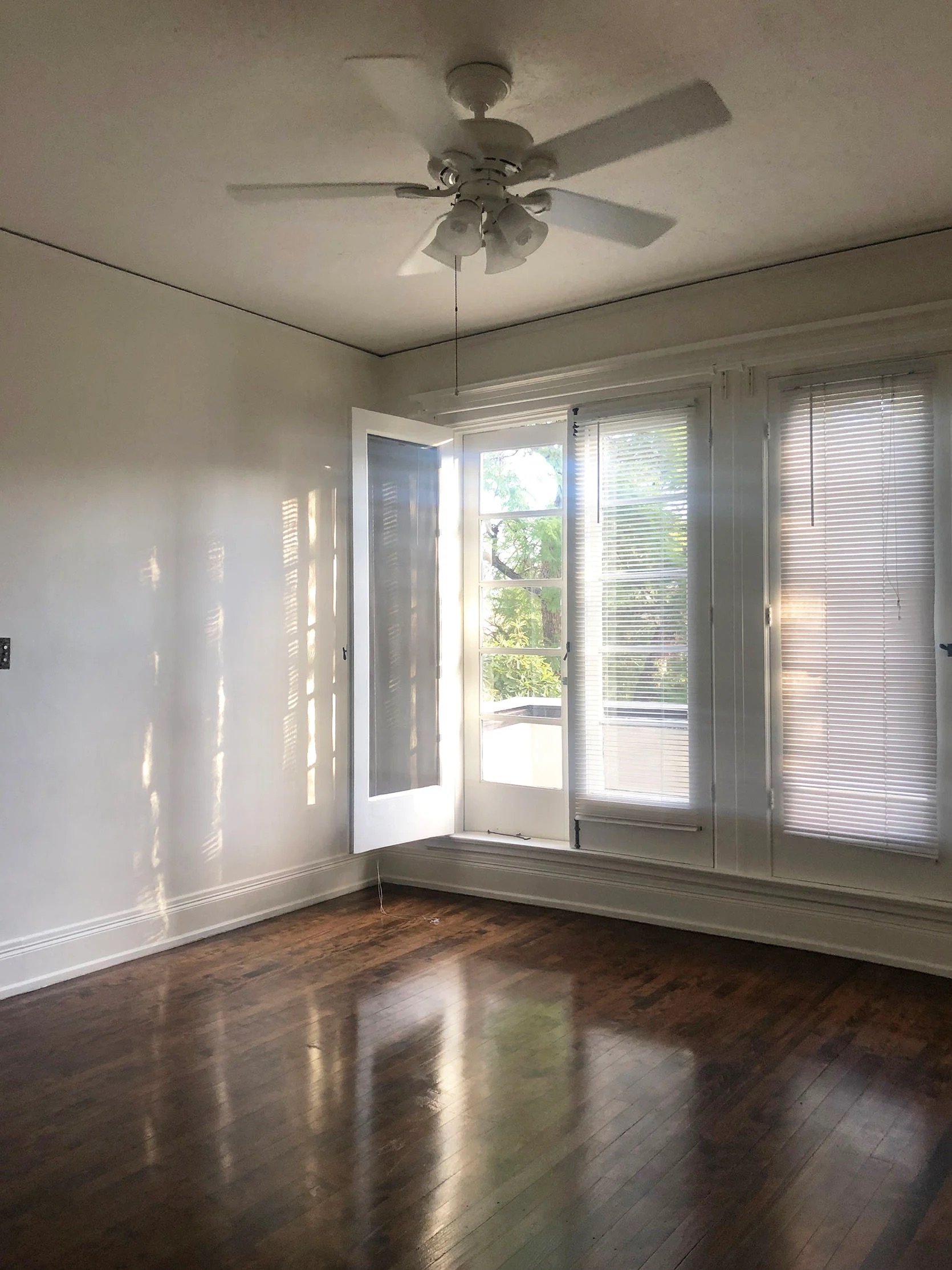 But as you can see, it had a beautiful base, but it needed some help. The ceiling fan was the first to go. I guess it could be worse, but I hated it. My AC unit is in the bathroom, which connects to my bedroom, so I really don’t have to worry about staying cool during the night. See ya, fan!