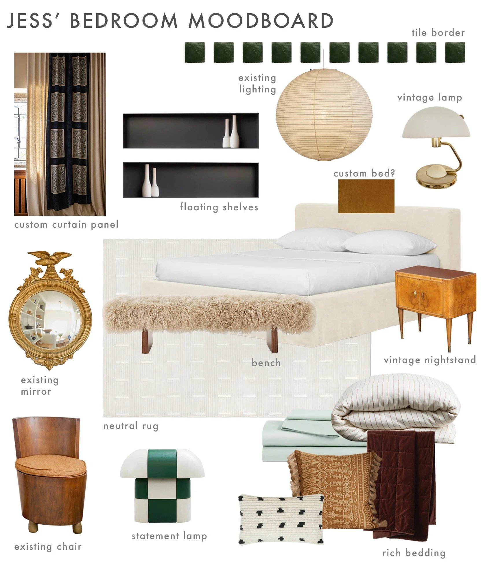 This was my first mood board. One thing you should know about me is that, for myself, I want a fairly simple bedroom. Mostly light neutralish colors, some pattern, but nothing too intense. Everyone is different, and for me, I feel calmest in a grounded yet airy bedroom. But the tricky thing about designing a bedroom that will go on the World Wide Web is that those kinds of rooms don’t always read well. And while none of us here ever “design for the internet,” I think it’s natural to want to make sure your room doesn’t feel too boring, to have ideas that are a little unique. It’s kind of a specific issue, but it was hard not to have that on my mind. That’s where those green tiles in the mood board above came in.