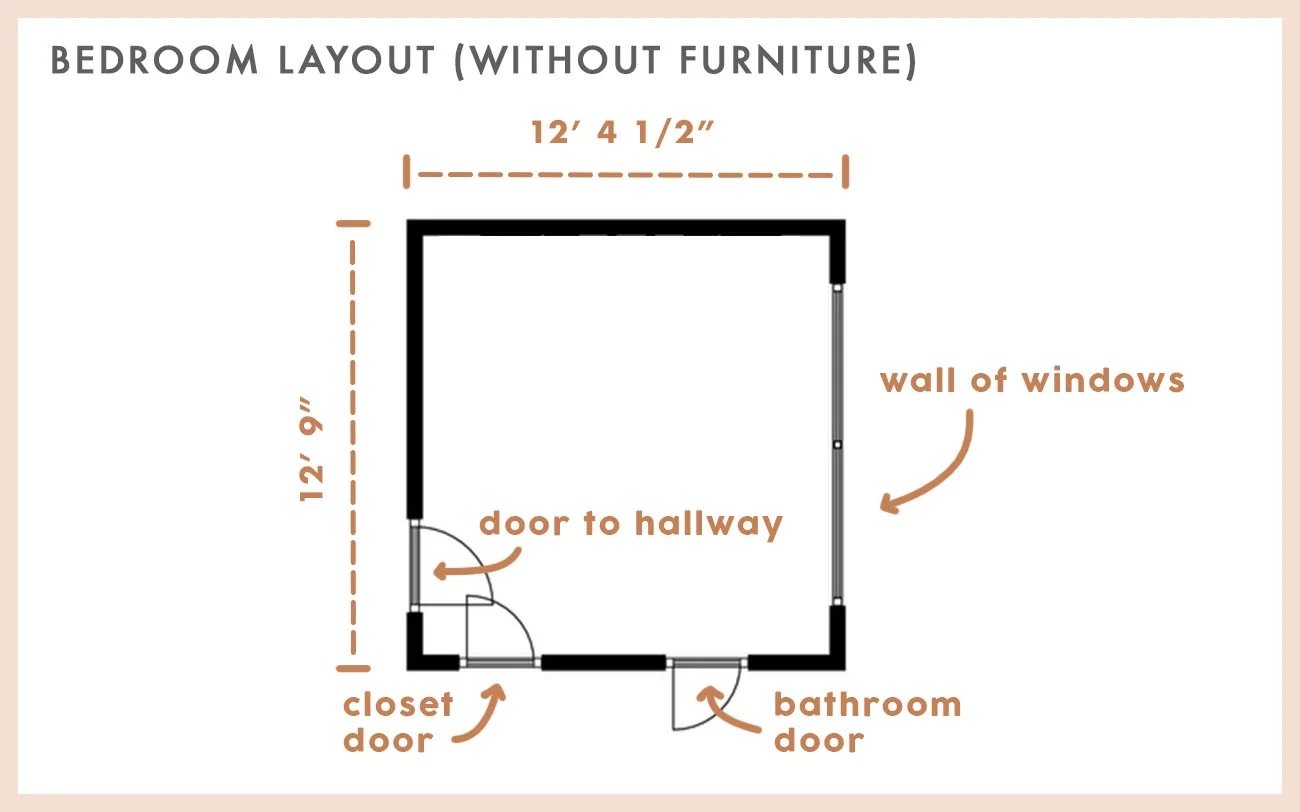 This is the layout with some measurements in case you were curious. How I was going to lay the bed out was always pretty clear since there are only two usable walls, and only one where I could have two nightstands. Having two nightstands was my dream because this was my last “bedroom”…