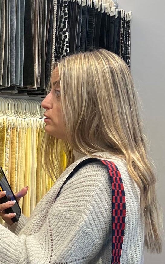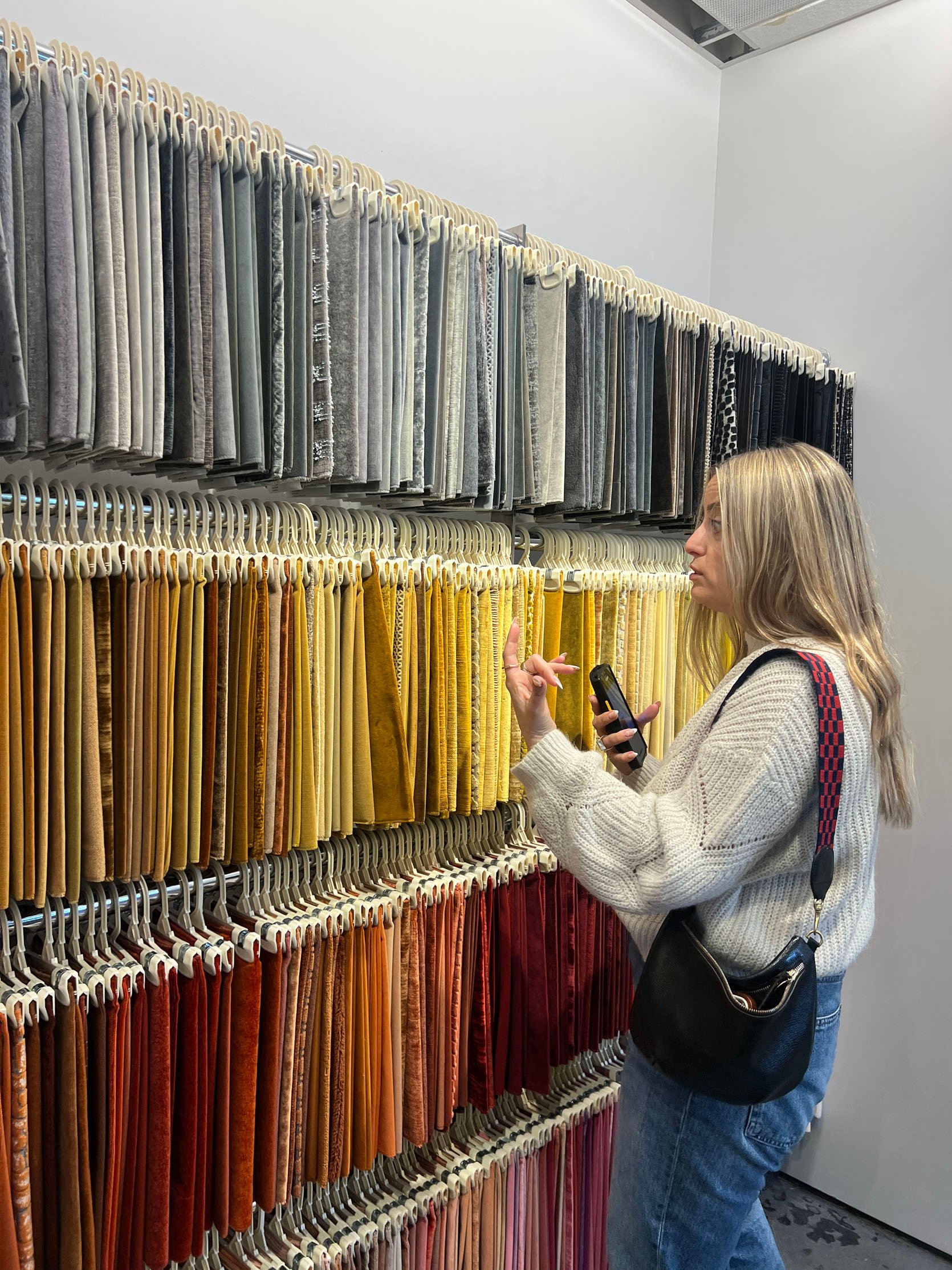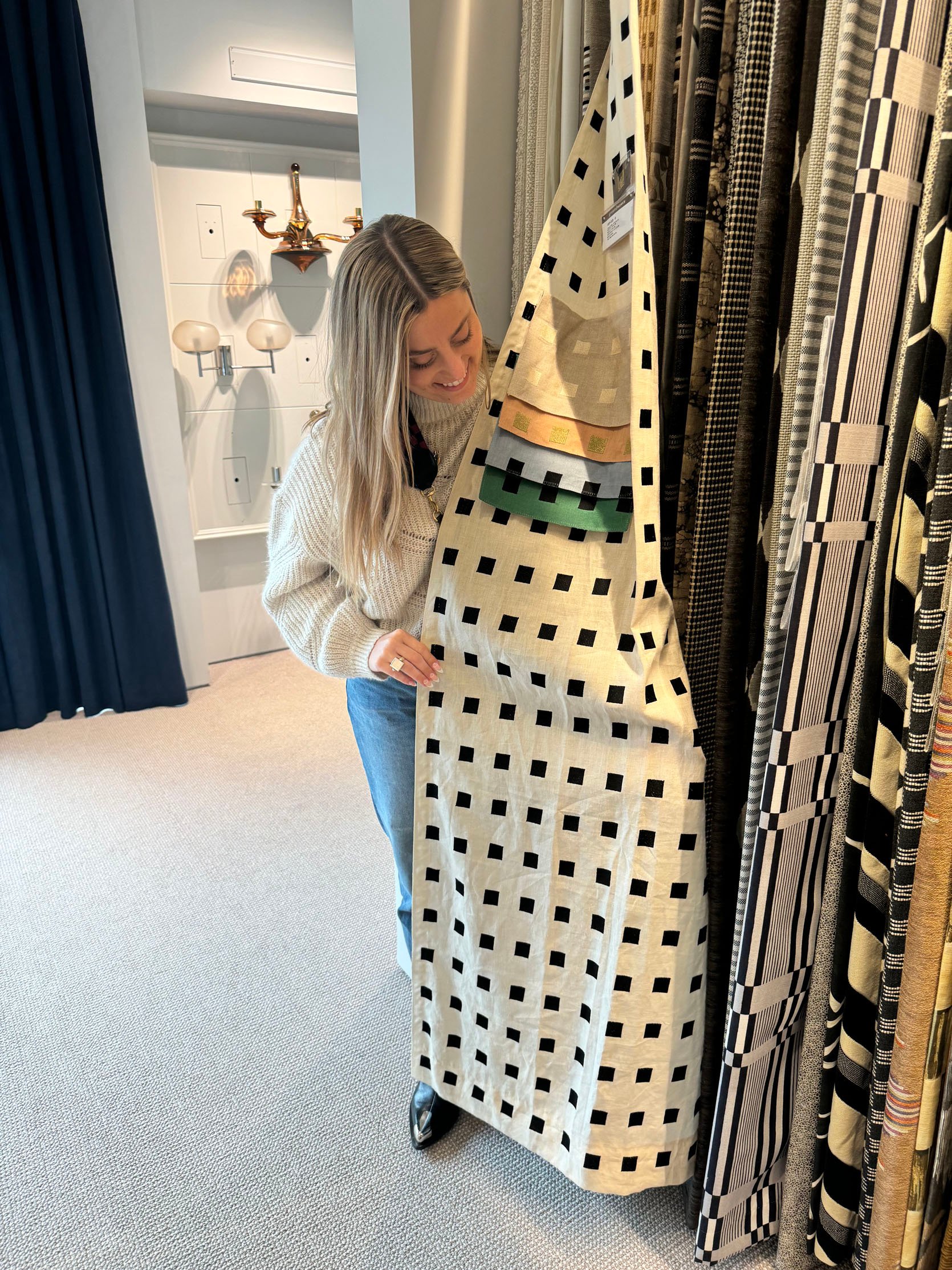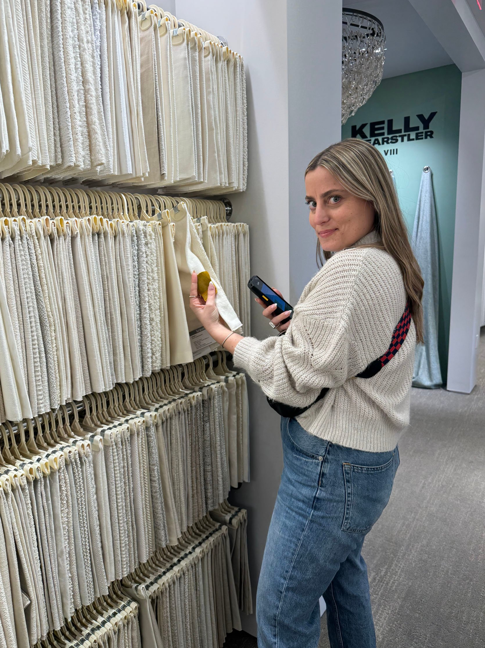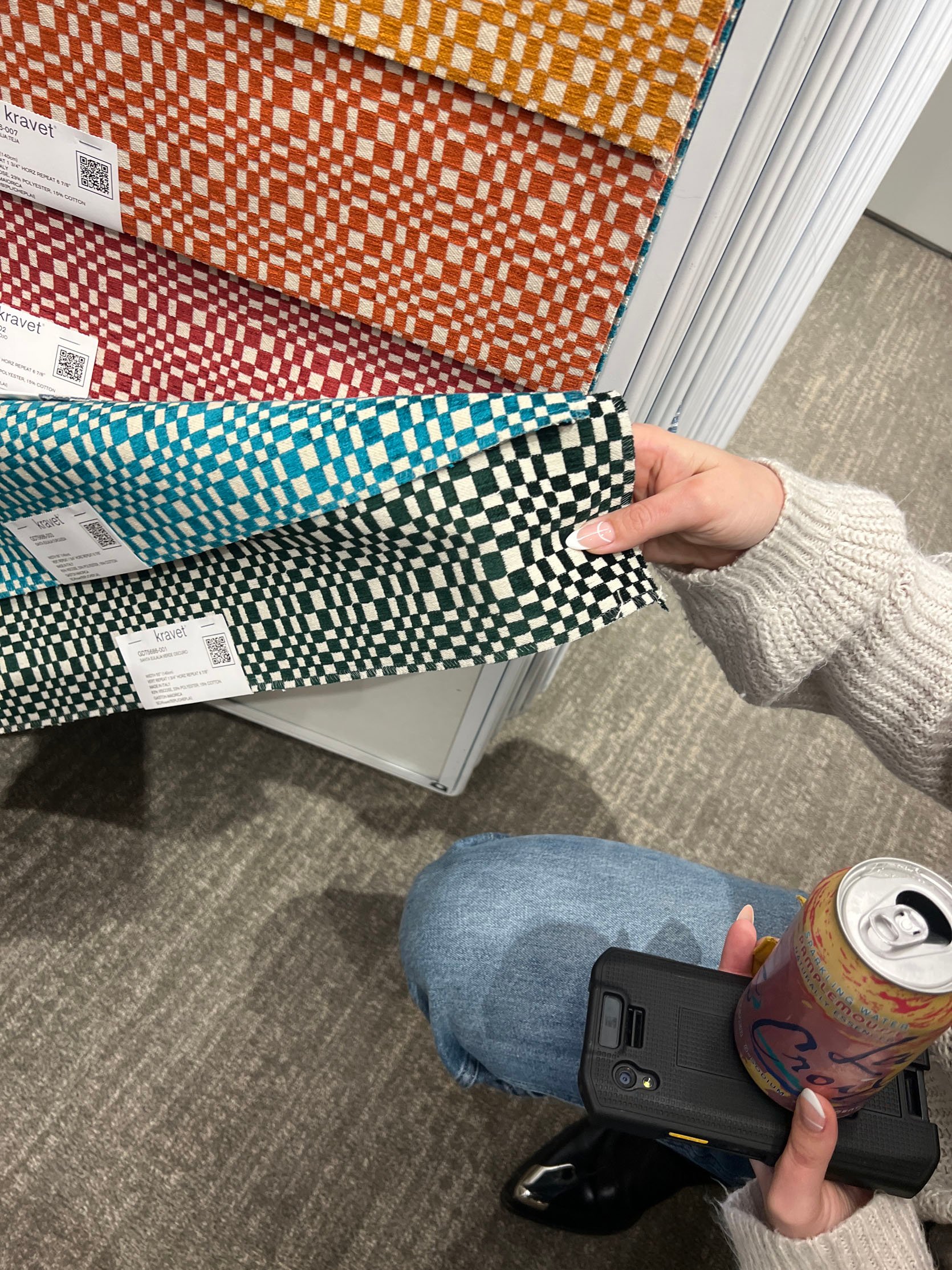 But like any design lover in a fabric showroom, I got the hang of it and found such special fabrics! Plus, that little phone-looking device that’s in my hand is a scanner. It’s like what I imagine wedding registry shopping to be like (or how the movies make it look), you scan, and then a beautiful little sample goes into your sample pile. Here’s what I initially chose…