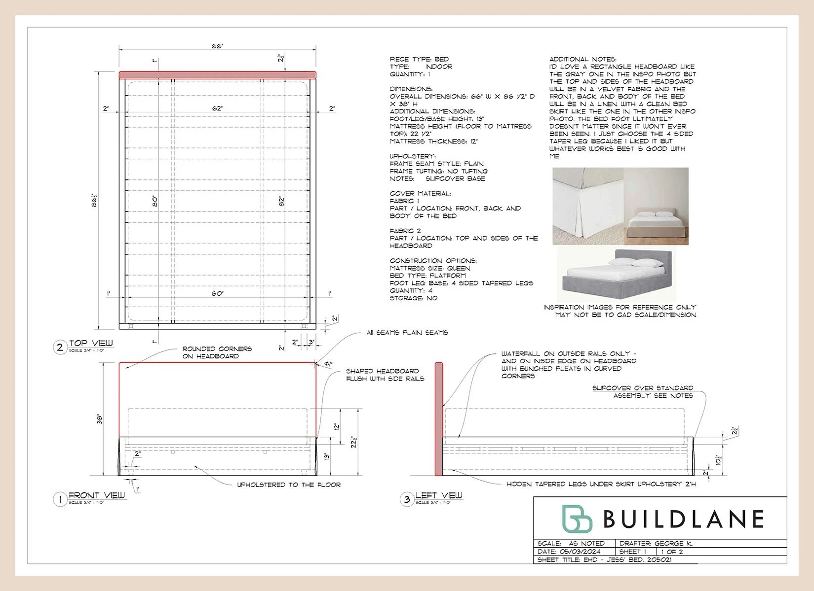 BuildLane graciously accepted my near plea to build me a bed. I didn’t want anything wild, but I also wasn’t seeing what I was looking for on the market. I mean, this was going to be the first real bedframe (with a headboard) I was going to own since college? I wanted it to be both special but also something I could easily reuse for future bedrooms. So I put together the design above, a classic upholstered low, rectangle headboard, and a skirt with corner pleats. But what was going to set this sweet, fairly common-shaped bed apart, design-wise, were the fabrics:)