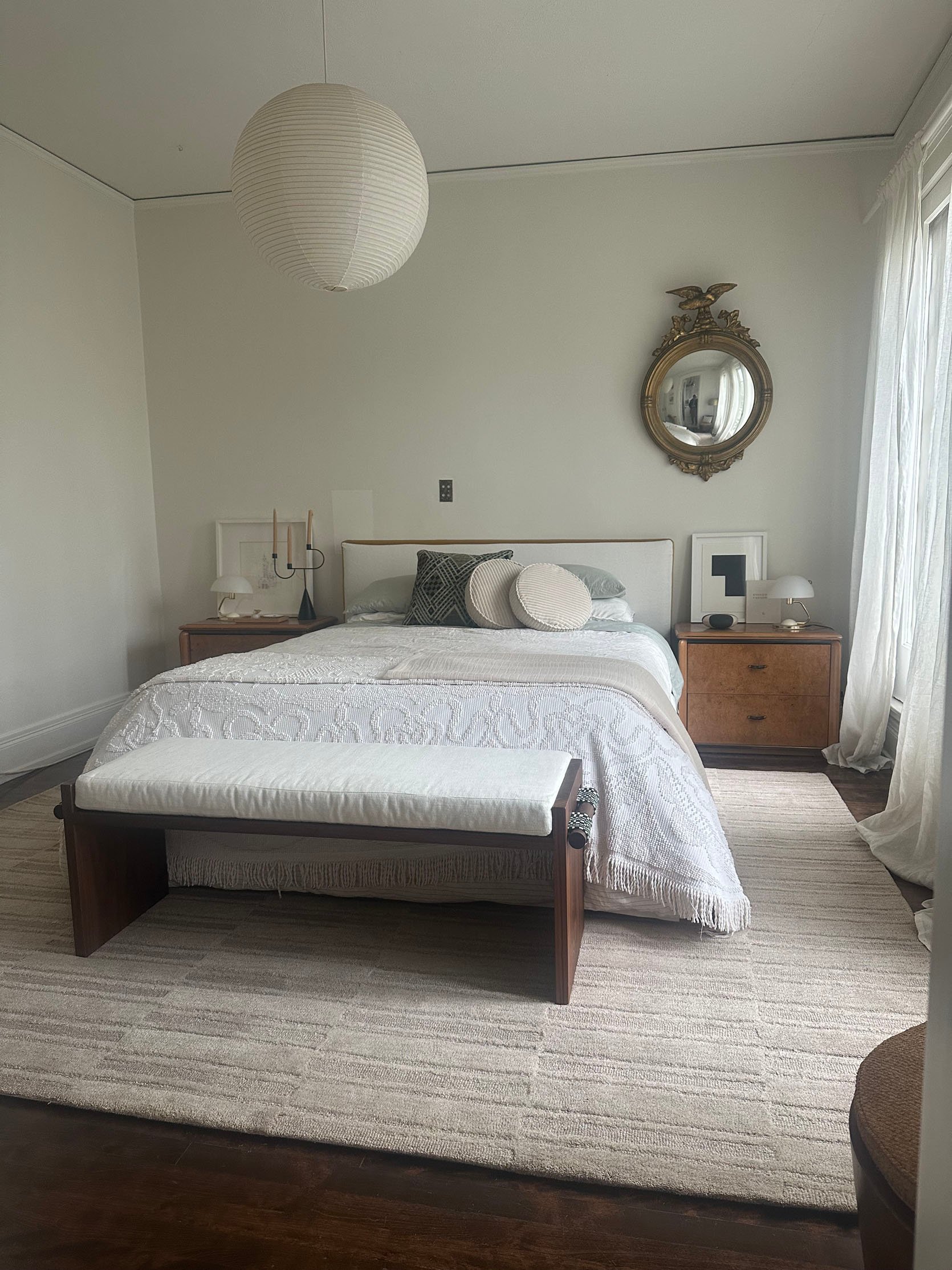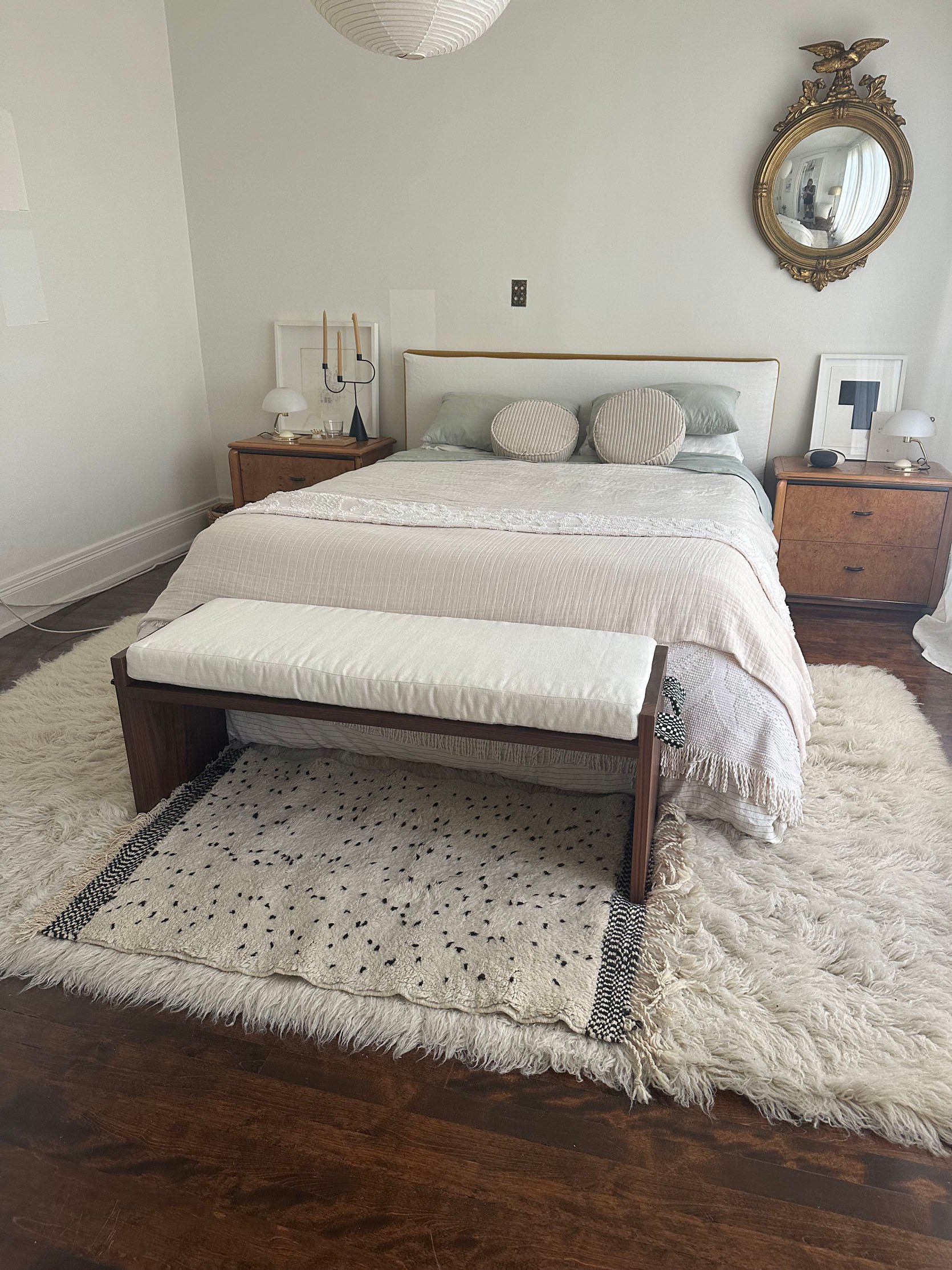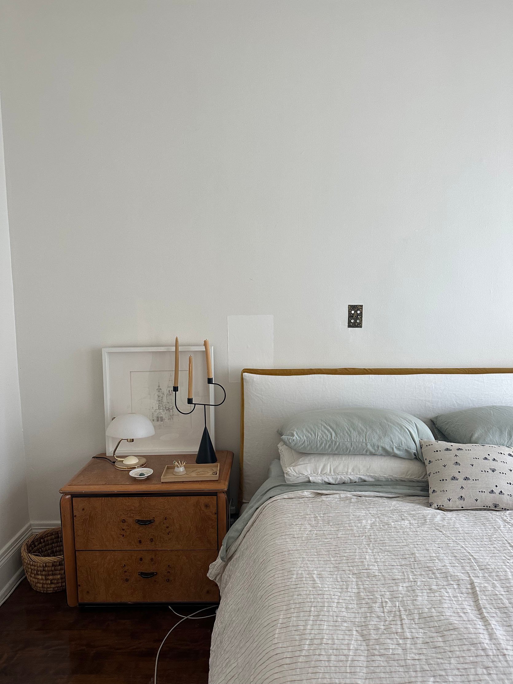 I did write about the nightstand search saga here if you want to fully go on that journey. But ultimately, I had my heart set on vintage to help give some more soul to the room. I searched high and low and then came across this beautiful burl wood 1970s set. I was able to get them at $550 and am so happy I did. I, of course, have to give a huge thanks to Julie again for coming with me (safety first, but also the seller was so lovely) and for helping me bring them upstairs to my apartment. I really owe her a fully paid vacation at this point for all the help she’s given me over the years. These beauties are hefty but give the perfect amount of weight to the room.