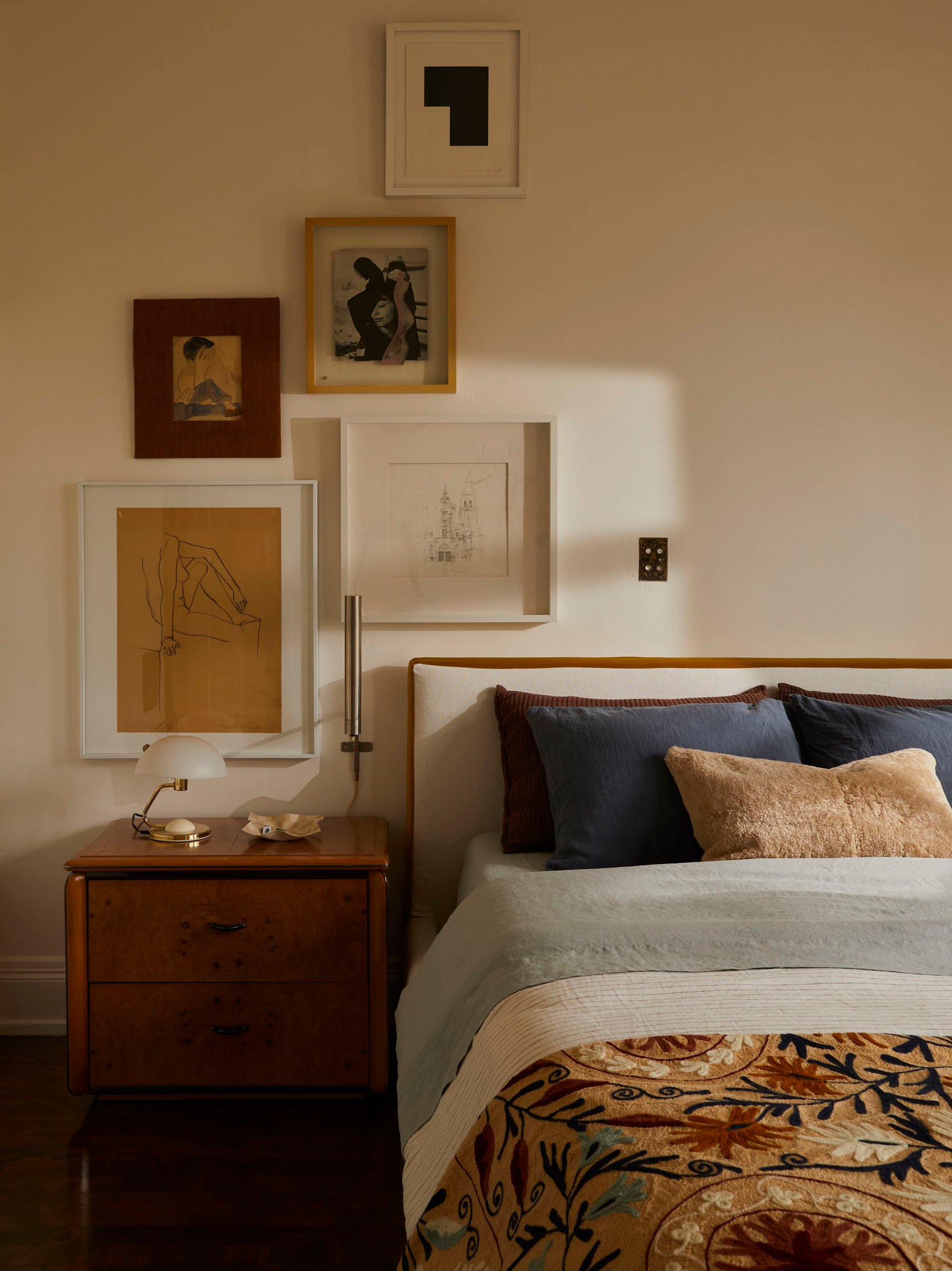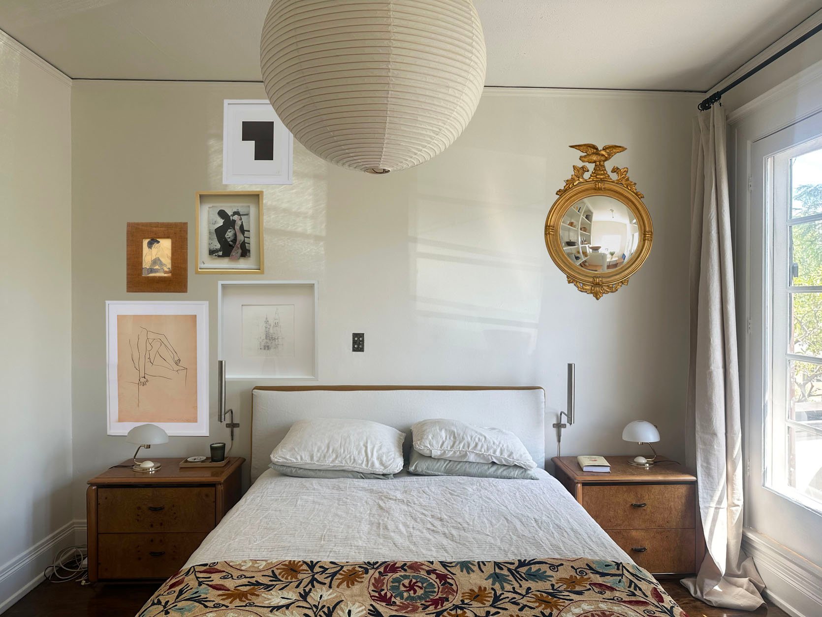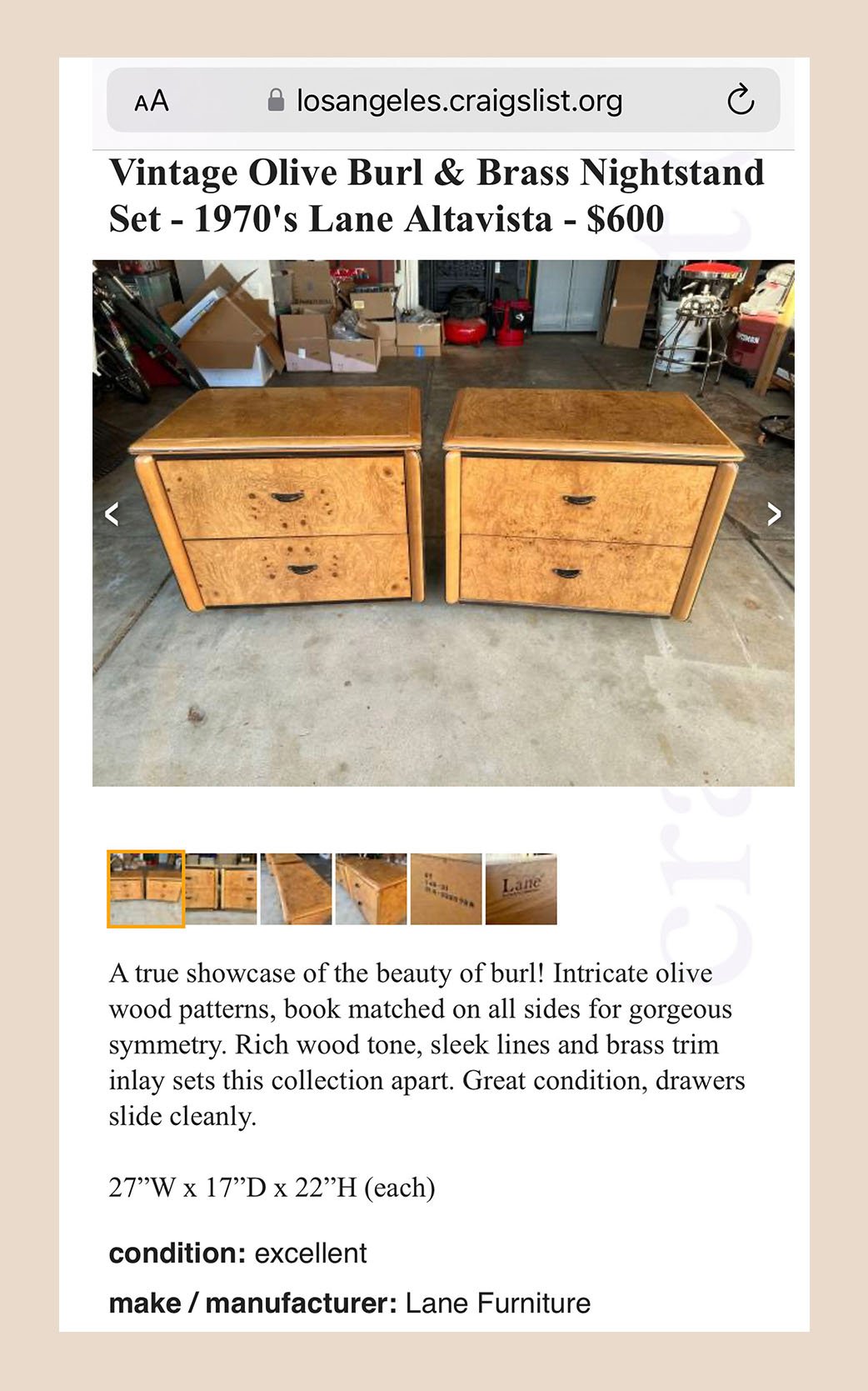 I did write about the nightstand search saga here if you want to fully go on that journey. But ultimately, I had my heart set on vintage to help give some more soul to the room. I searched high and low and then came across this beautiful burl wood 1970s set. I was able to get them at $550 and am so happy I did. I, of course, have to give a huge thanks to Julie again for coming with me (safety first, but also the seller was so lovely) and for helping me bring them upstairs to my apartment. I really owe her a fully paid vacation at this point for all the help she’s given me over the years. These beauties are hefty but give the perfect amount of weight to the room.
