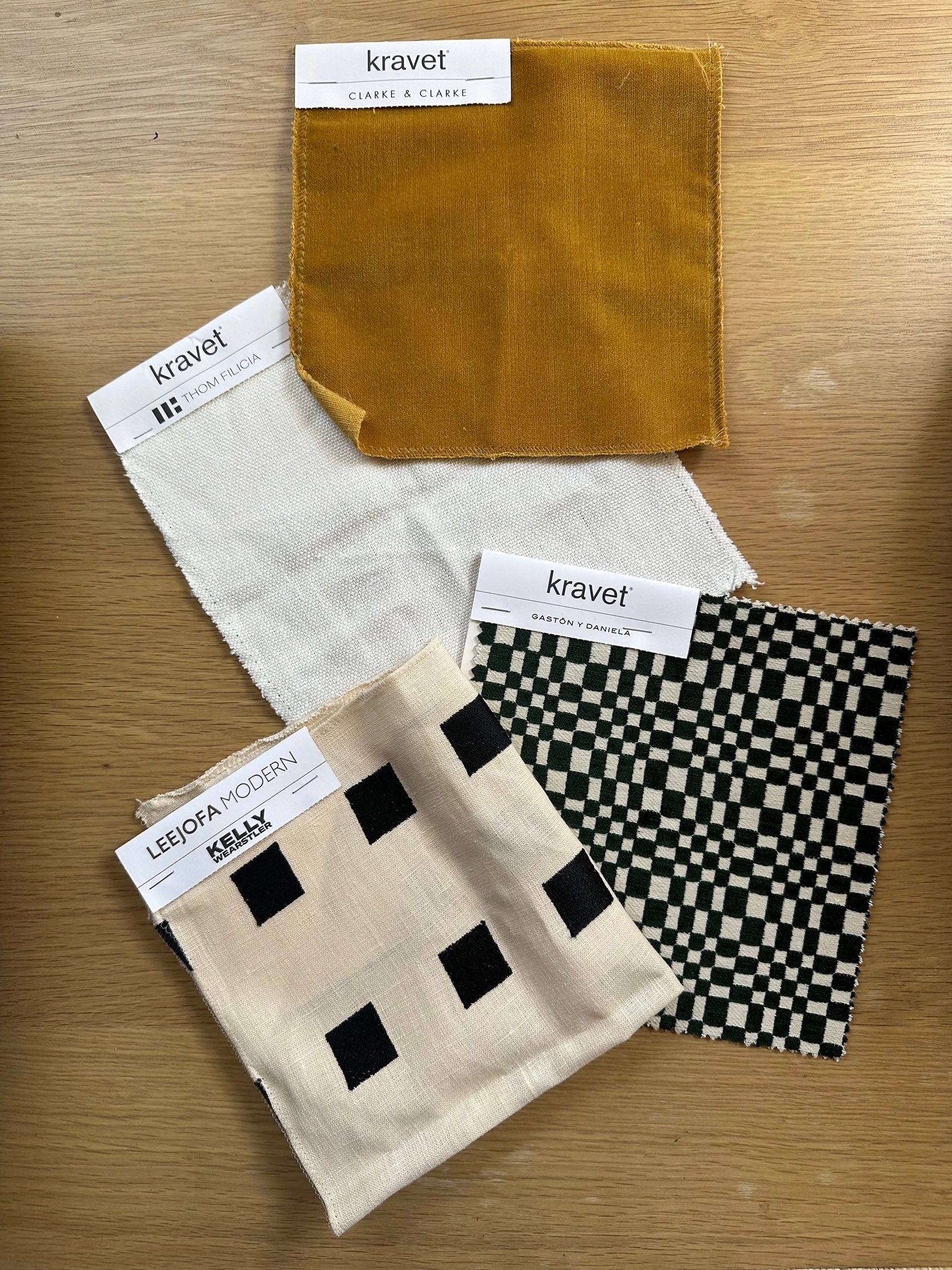 Man, I love looking at these all together. The solid linen (Kravet Basics x Thom Filicia in Sweeting – Ivory) and gold velvet (Clarke & Clarke in “Honey”) were for my bed, but the other two were for a bench that THE Katy Skelton offered to gift me. Another insane pinch me moment. So that bench has a fabric seat that’s customizable, which I took them up on. So the two “checkered” fabrics were for that. Unfortunately, the Kelly Wearstler embroidered square fabric (Chalet Emb – Ivory/Black) was backordered, so I decided to go with another solid linen (Kravet Basics). That way, I could have more freedom with the bedding by not choosing a different pattern. But what I loved about the Kelly Wearstler one was that it was neutral, textured, and a different scale than that perfect green fabric (Gaston Y Daniela – Santa Eulalia – Verde Oscuro). All of these are stunning in person.
