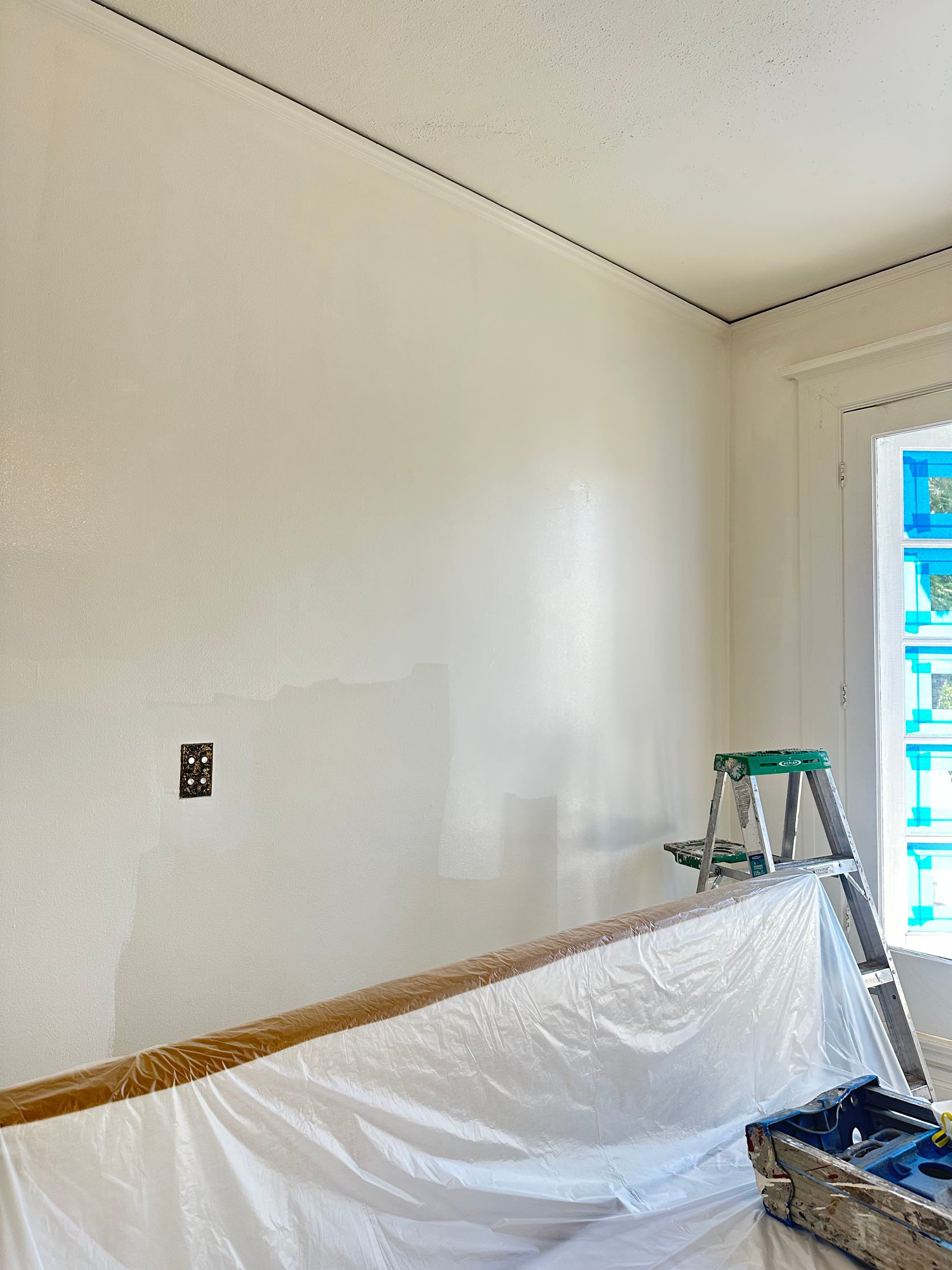 Here they are – one in bright daylight and one much later in the day. It still shocks me that a color can look like a fairly standard white on a paint fan deck, but then you get it in the soon-to-be-painted room and it completely transforms. Those “whites” range from white to blue to green to yellow. Let this be a reminder lesson to test your paint before you buy. Paint (especially trim paint) is not cheap. My bank account will tell you! So if you can, we truly love Samplize, and they will help you make the best decision with zero mess. The dream, right?