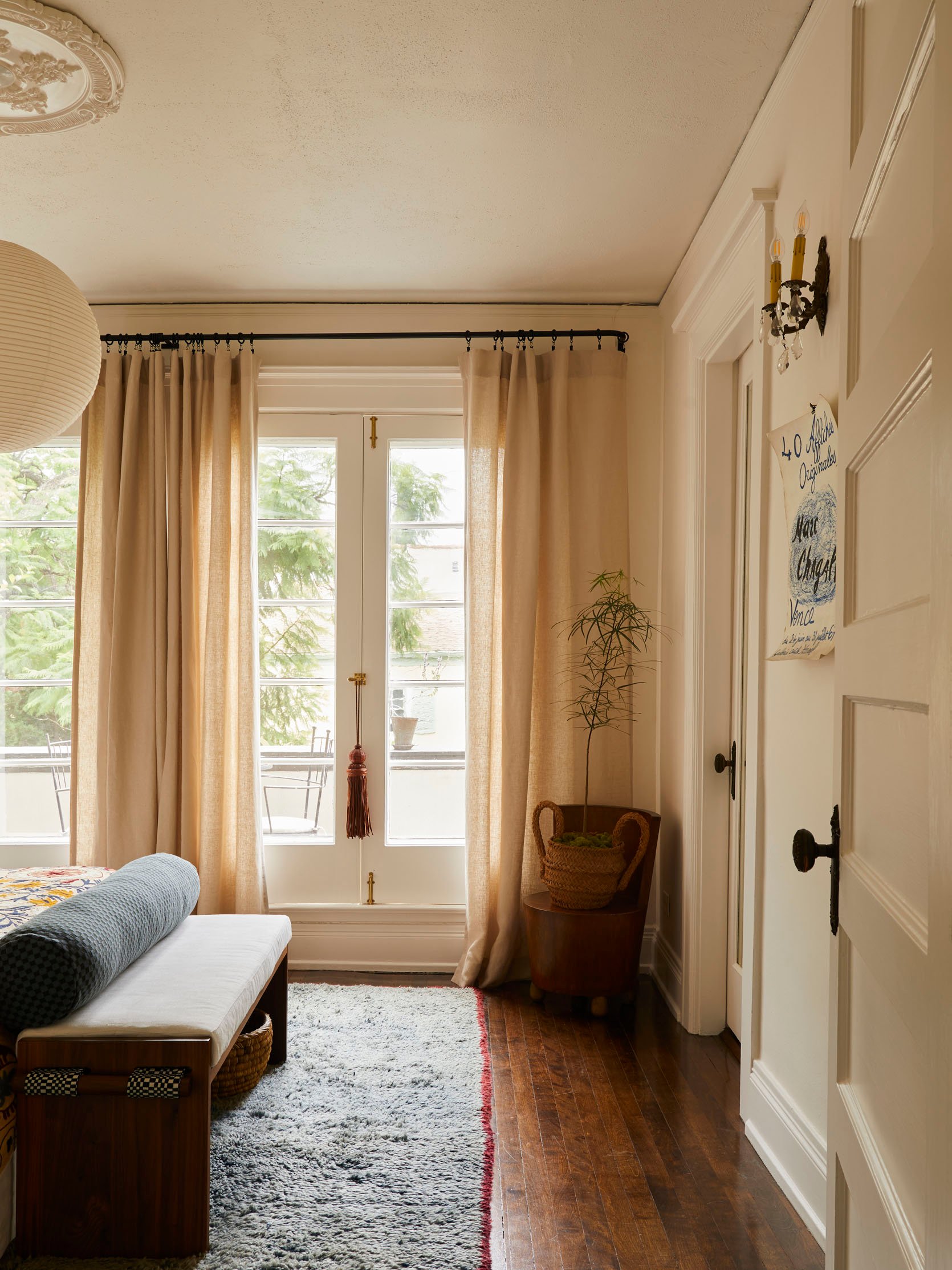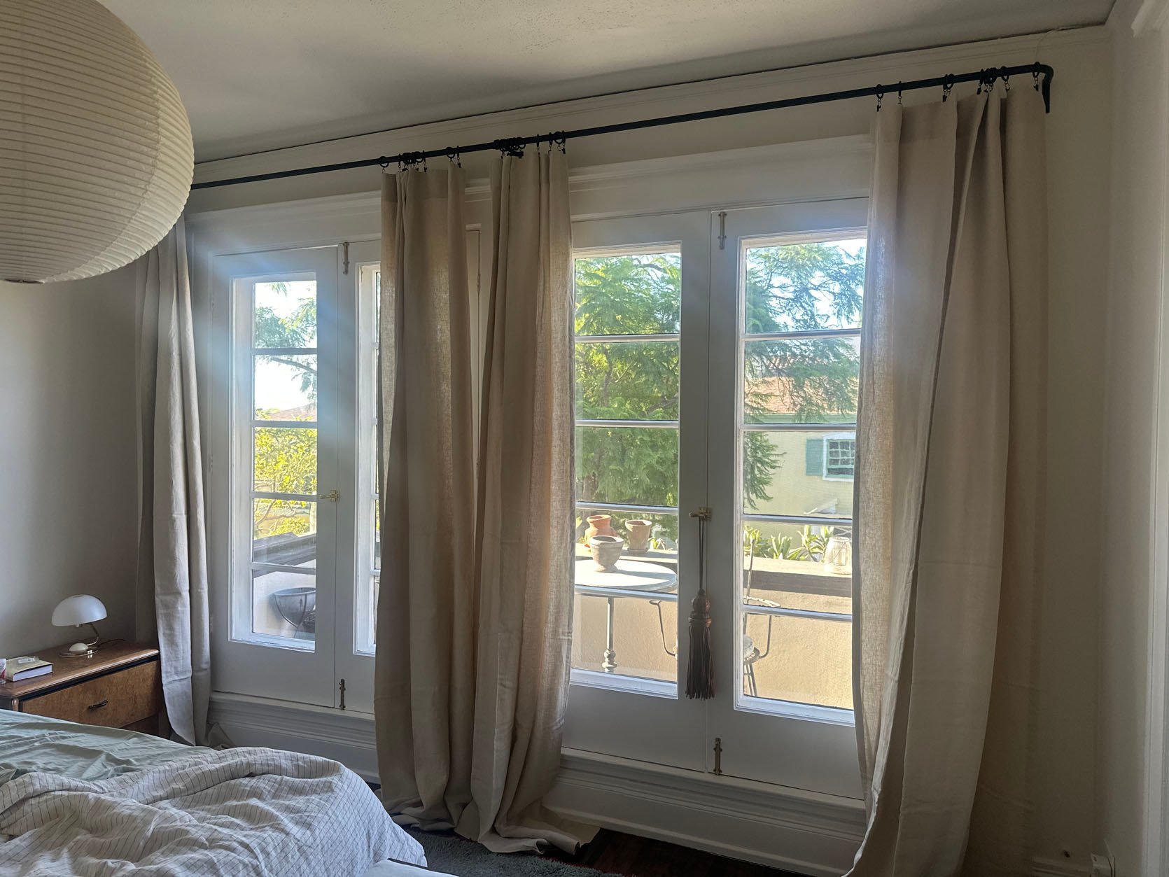 I found the perfect “natural” linen curtains from Anthro, who also gifted them! I was so grateful! I did, as you can see, need to get them hemmed. The next size down was too short, so I marched them over to my very wonderful dry cleaner to fix them up. Fun fact, my ceilings and/or floor are slanted, so I had to give them three different length measurements. Second, it did cost me around $300. Linen is hard to hem, FYI, so I knew it wouldn’t be cheap. But now they look great with the custom-length curtain rod I had to get. This room may look simple when you see the pretty photos (and boy did Sara outdo herself), but this room added up QUICK.