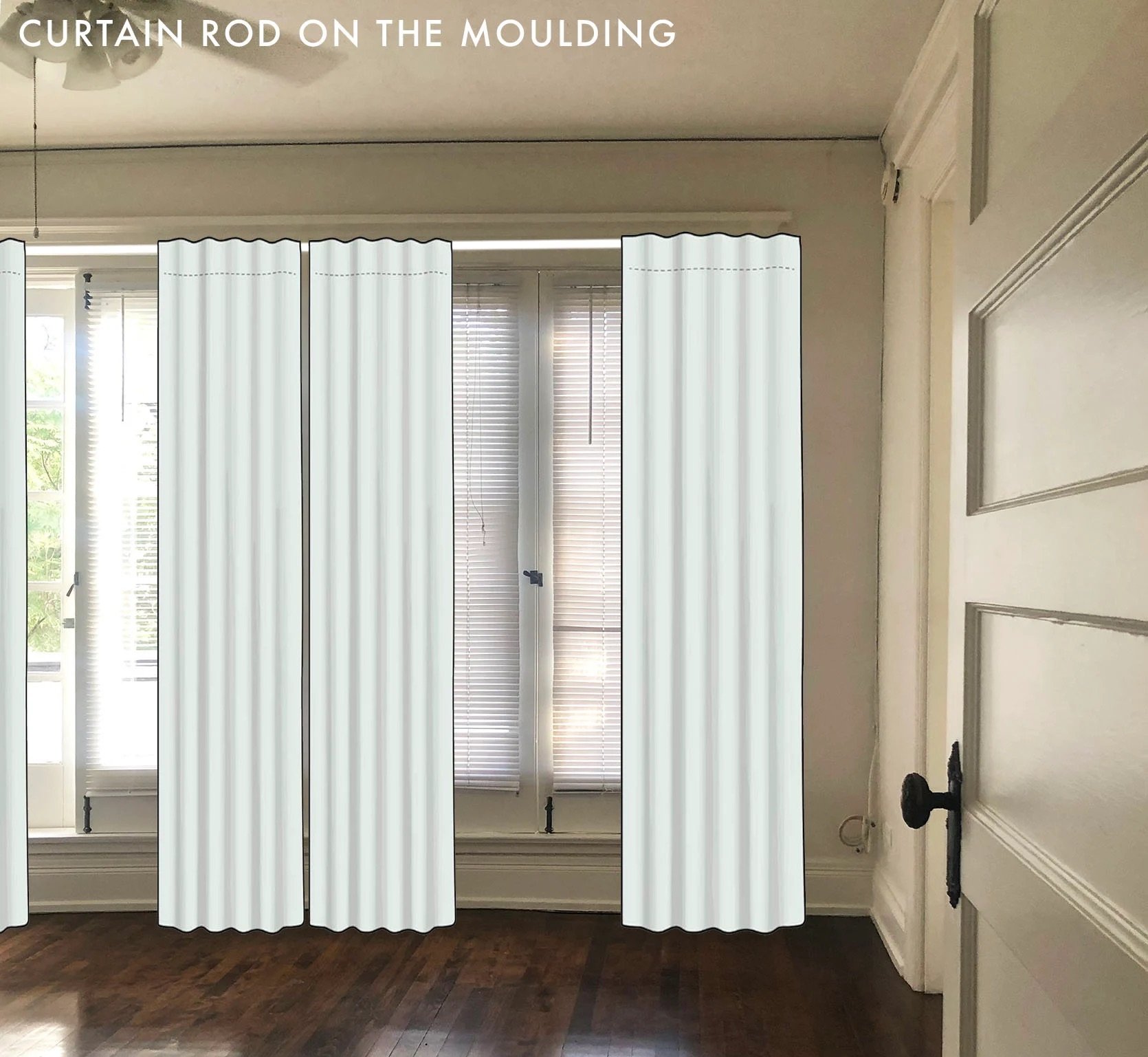 The next question was rod placement. I felt pretty sure I wanted to go higher/above the door moulding, but just to be 100%, I did this little mock-up. I knew the room would feel taller if I went higher, so this helped me confirm that.