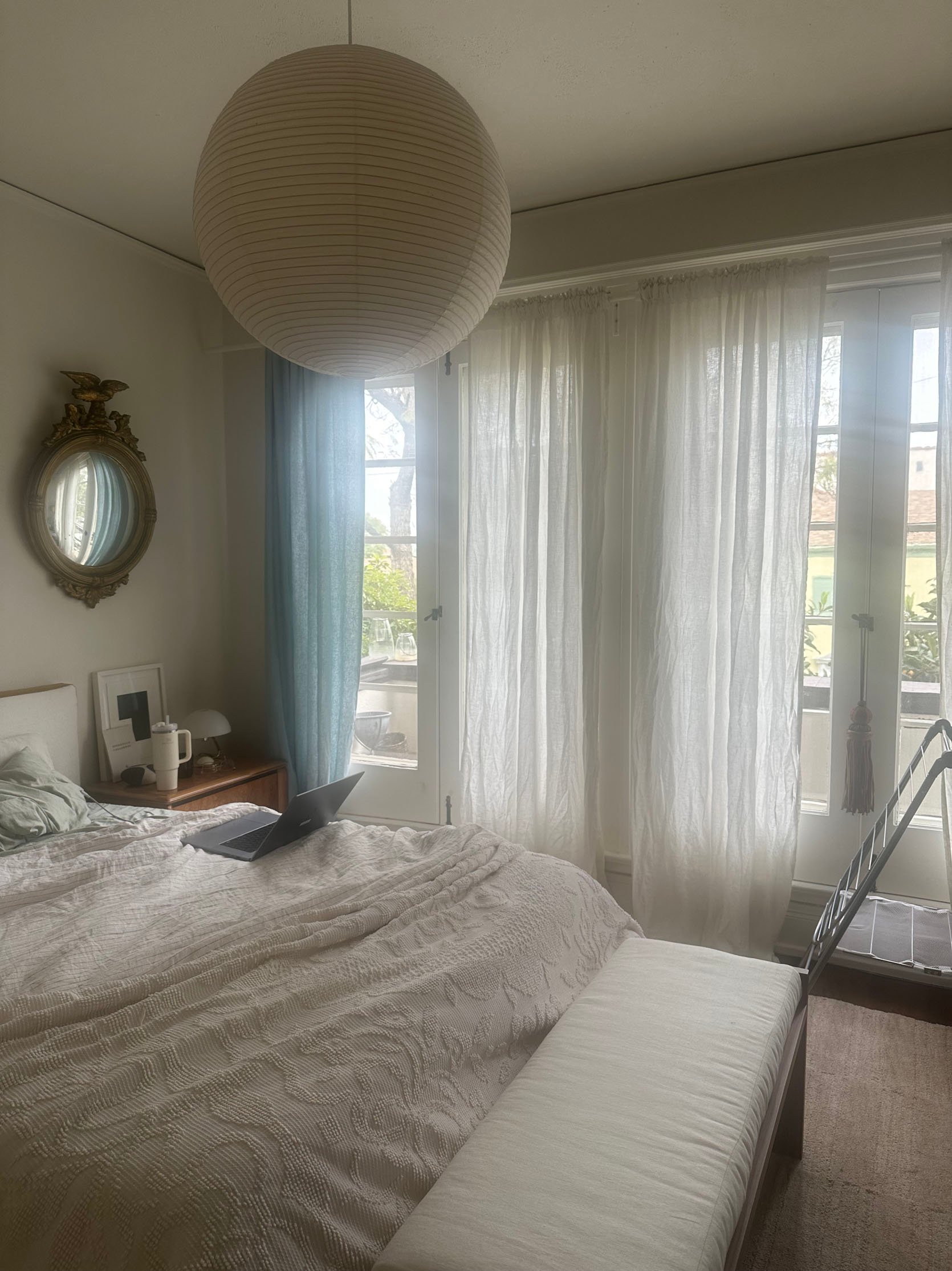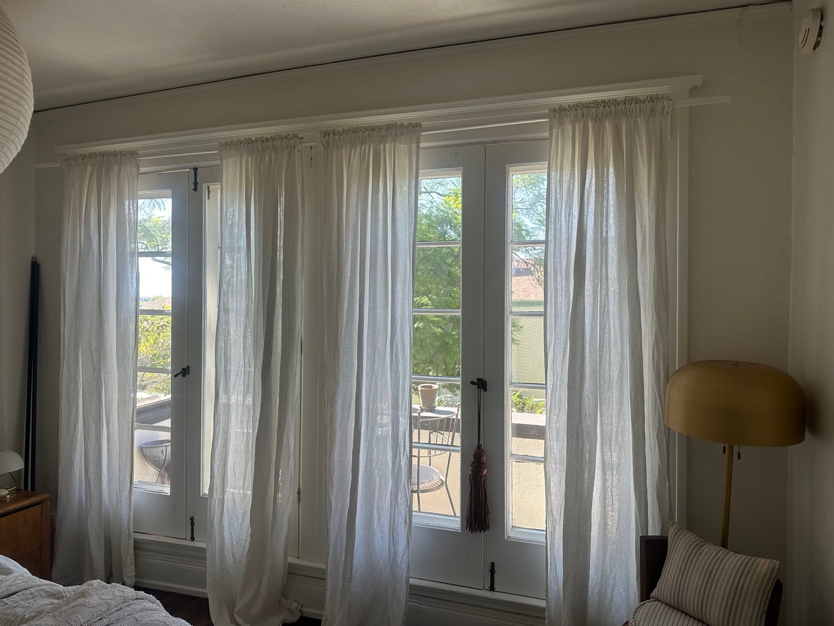 In addition, I was trying to find the right curtains. I had the urge to try a light blue. Sure, it’s on trend, but curtains can be perfect for that. Plus, light blue wouldn’t be that intense, right?? Well, I ordered this panel from Quince to test out. While I was impressed with the quality, the color wasn’t 100% what I was looking for. Also, it would have been one thing if I had one smaller window or two windows flanking my bed, giving the curtains some breathing room. That would not have been the case in my room. I feared it would look like a wall of light blue coming at you, overwhelming your eye, and taking all the attention in an otherwise light neutral room.