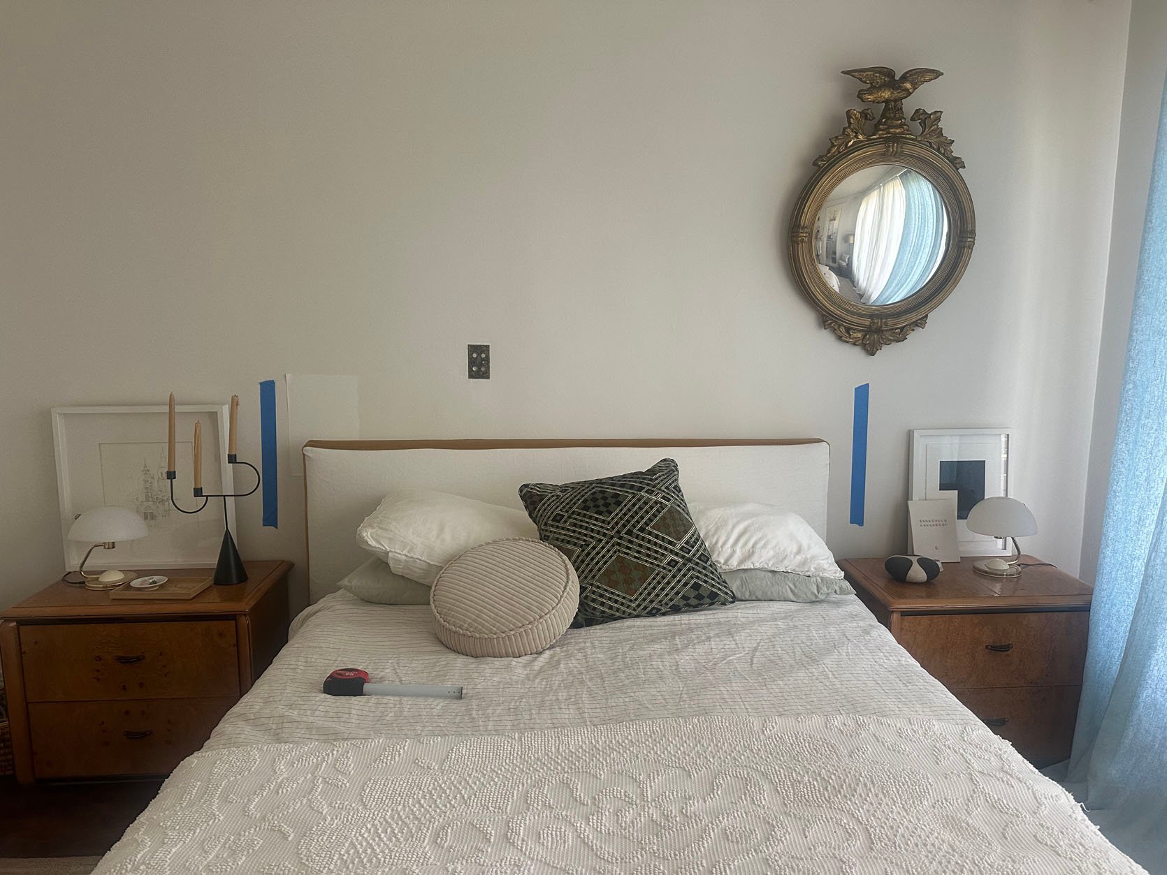 I think this was the most stressful part of the bed designing process, the height of the headboard. I wanted it low but not too low so that I could stack two sets of pillows, but still see some of the headboard at the top. So naturally, blue tape got involved. Thankfully, the height turned out perfect at 38″ from the floor to the top.