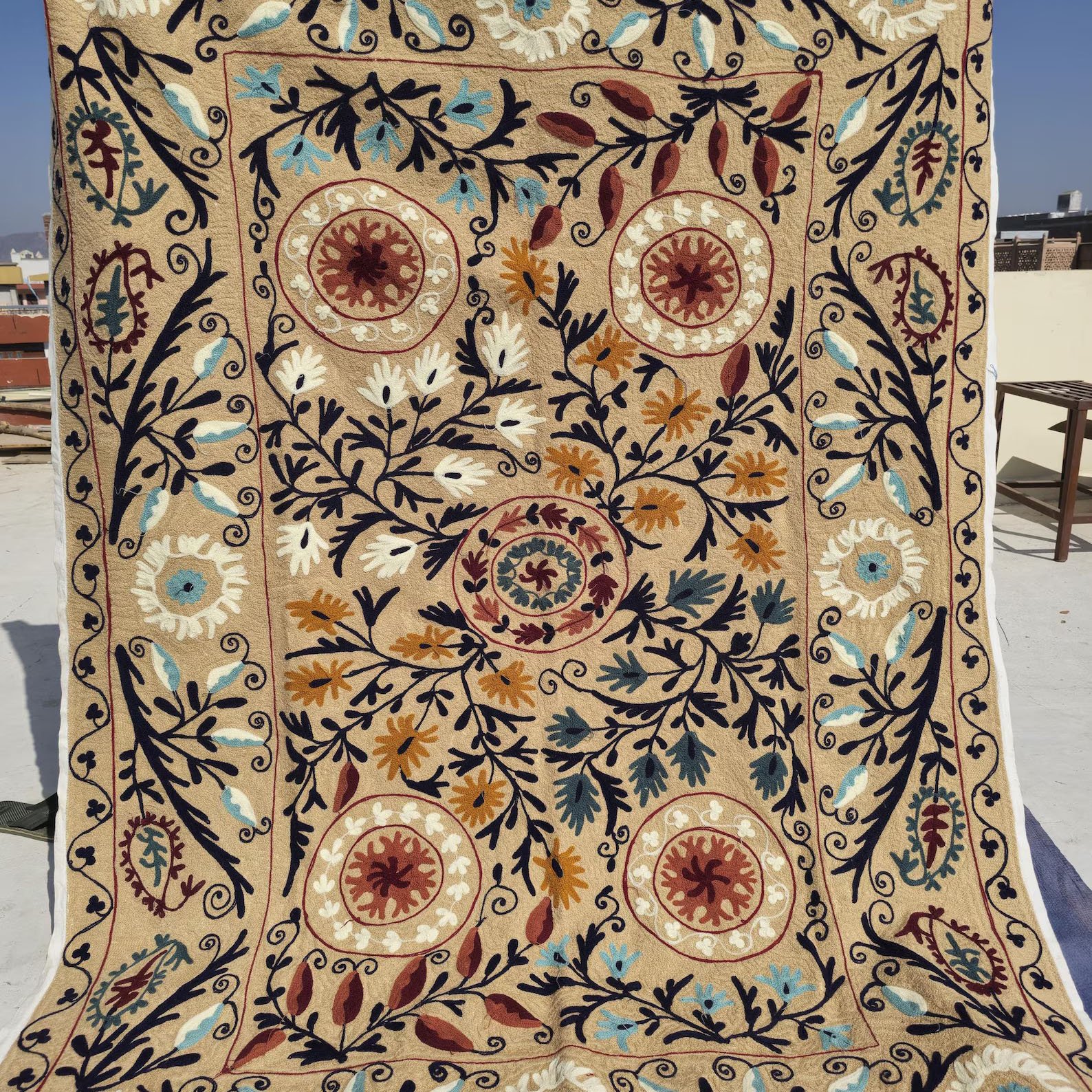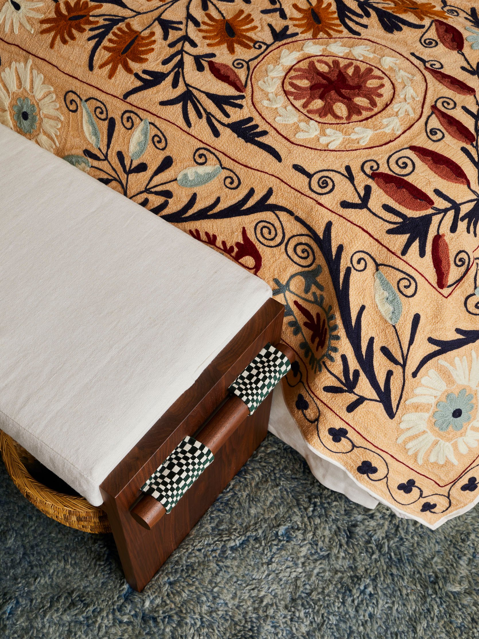 “Suzanis are elaborate embroidered textiles whose name stems from the Persian word suzan, or ‘needle,’ as I mentioned earlier. They emerged from the nomadic cultures of Central Asia, mostly what is modern-day Uzbekistan, Tajikistan, and Kazakhstan, where embroidery was a key expression of identity and artistry. There aren’t many surviving older textiles, as these groups were nomadic and lived on the move; most of the original and authentic suzanis we have today date back only to the 18th and 19th centuries, though some believe the art form goes as far back as the 15th century.”