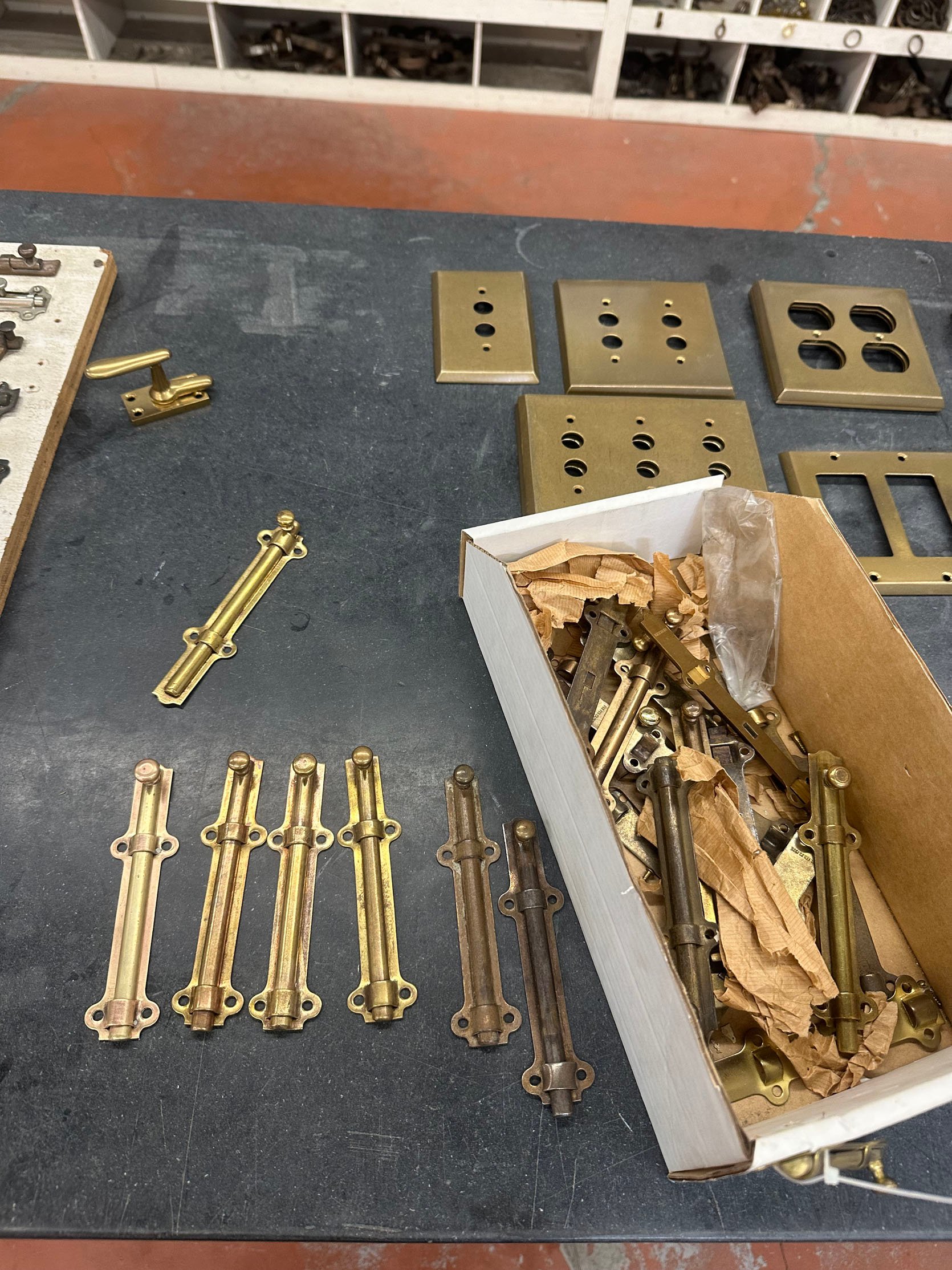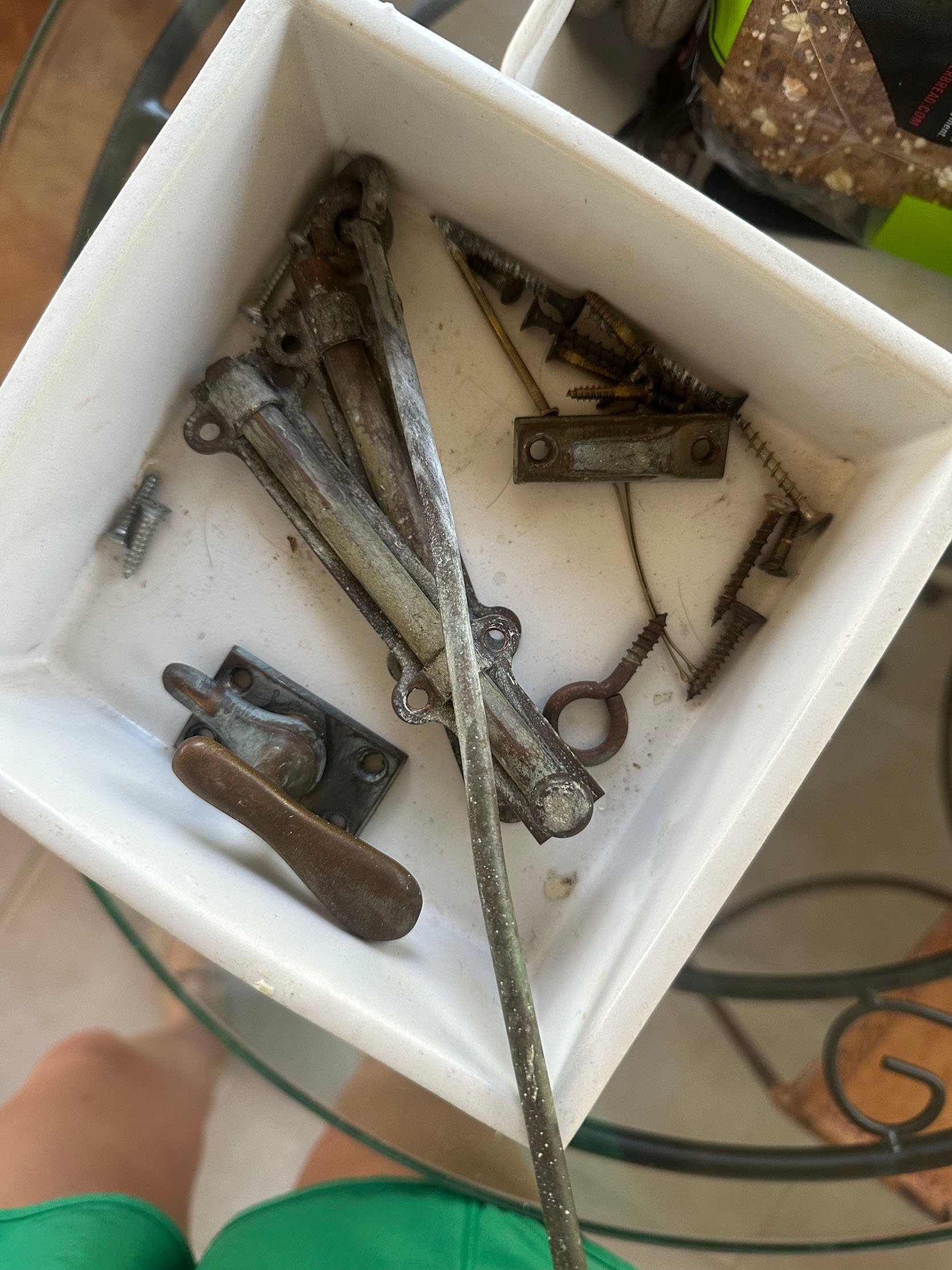 You may have clocked the hardware that’s on my French doors. I didn’t mind the finish, but some of them had paint on them from years of old paint jobs. I decided to soak all the good ones (some had missing parts that I would try to replace) that just had paint on them…