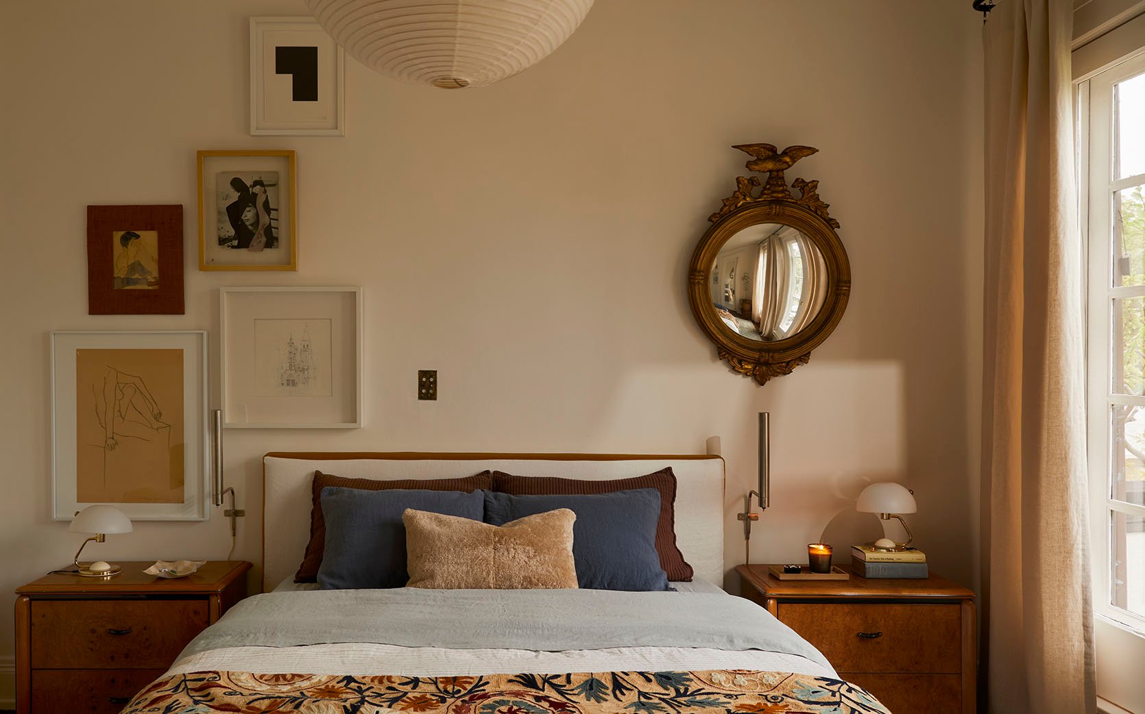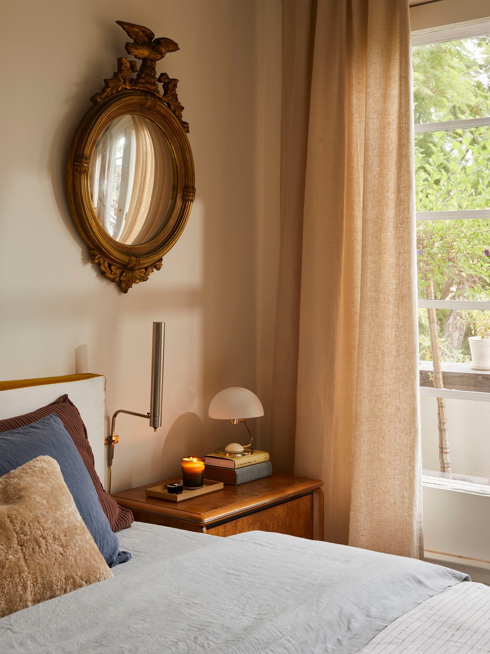 Welcome to my side of the bed. That mirror has been in my family for at least of few generations and was in our home growing up. You might remember I had it in my last kitchen🙂 But it felt right in here. I also have to sing the praises of that garden mint candle by Tatine that Sara introduced me to 6 years ago? It’s so fresh, so potent (but in the good way), and I don’t even have to light it to get those amazing moments when I breathe in, and it’s all I can smell. That sweet little box is hard to see, but I got it at the Pierce and Ward shop. The tray was from Emily, and how cool is that sconce?