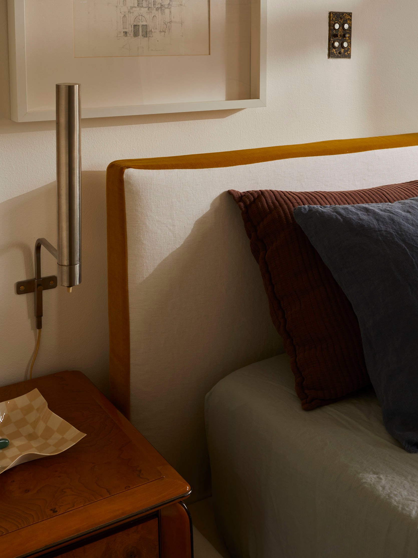 Let’s first talk about the bedding. My duvet cover is actually the one that Arlyn also used in her bedroom reveal, and I didn’t even clock it when I bought it on a Black Friday sale a couple of years ago! Great minds, as they say:) It has a very delicate rust colored stripe. The touch of warmth is perfect. I am also sorry it’s not available. The sheets are actually linen from Quince. Here’s what I’ll say. The color is stunning, the price is great, but they aren’t the softest linen sheets I’ve ever tried. Marlee really loves hers, so maybe after more washes, it gets softer? But if you’re sensitive, be wary of these. The blue linen pillowcases are from Parachute, and you immediately notice the difference. It’s a classic “you get what you pay for,” but I’m not upset with the Quince sheets! I just want to give an honest review. So in conclusion, they are good, but not great. The raisin colored shams were Bowser’s and are old Parachute. Why they don’t sell the color still is insane. BRING IT BACK. I did a little search and was able to find just the simple linen pillowcases in that color on Poshmark (a little hack from me to you), so my bed still practically looks like this. And that tan shearling lumbar pillow is everything. I was planning on returning it because it wasn’t cheap, but I couldn’t bear to part with it. It’s also just so soft and adds some needed brightness and texture.