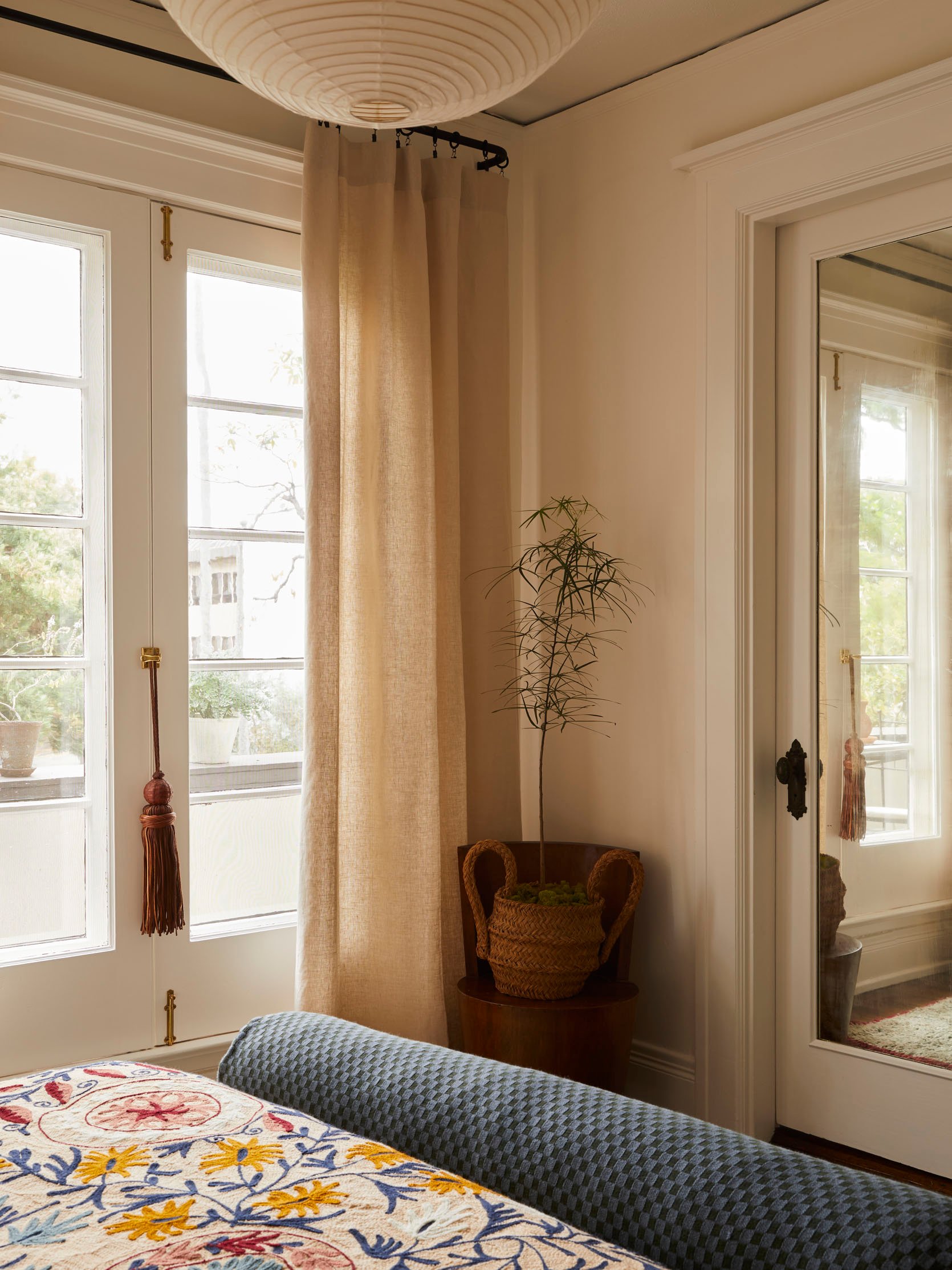 Pendant Lamp | Ceiling Medallion | Rug (vintage) | Curatin Rod | Curtain Rings | Curtains | Hardware | Leather Tassel (unavailable) | Bolster Cover | Bolster Insert | Chair (vintage) | Basket (vintage) | Chagall Poster (vintage)