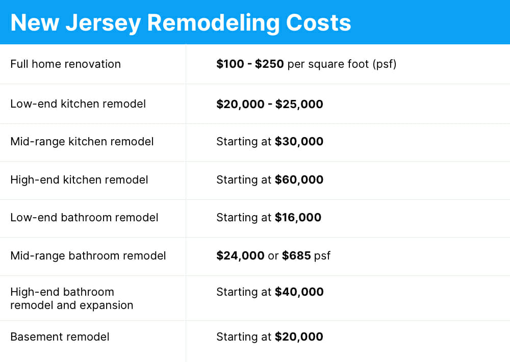 Here’s a breakdown of typical starting home renovation costs in New Jersey, compiled from Sweeten renovations and Remodeling’s Cost vs. Value report. Renovators in denser areas closer to New York City will likely see slightly higher budgets.