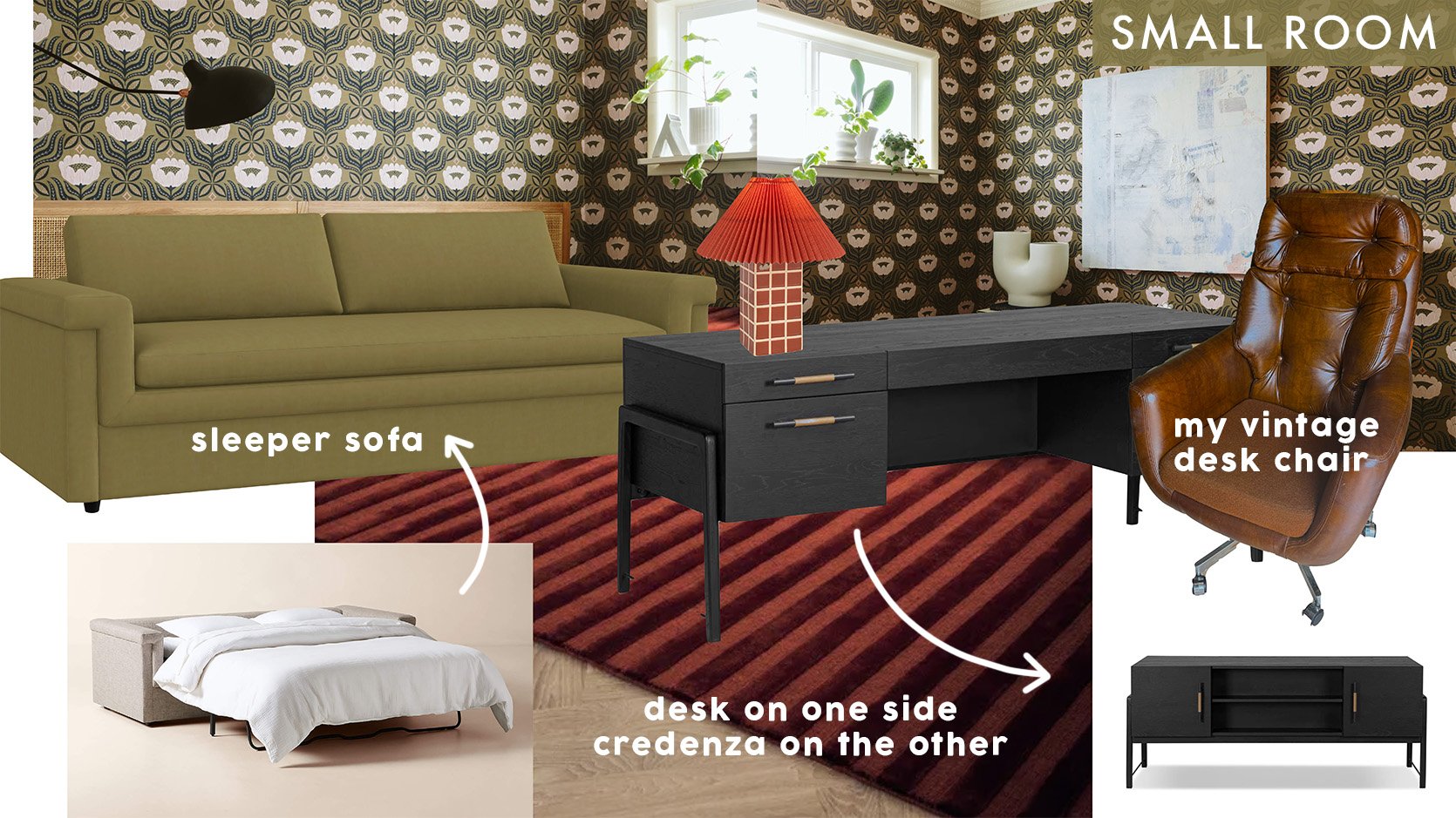 Initially, I had imagined a green sofa bed in here. It had to be a sofa bed to save on space and maximize room function. But it’d need to be the perfect Goldilocks Green to work with the green on the walls, and I just didn’t want to chance it. I figured something more neutral, a beige, gray, or cream would be better overall. I was in-between sleeper sofas. Initially, I liked the 84″ Cleo Sleeper Sofa for its compact shape and long list of customizable colors. But ultimately I chose this one, the Savelle 88” Upholstered Sleeper Sofa (in Mink Chenille) because it shipped a little faster, had stellar reviews, and still looked just as good. Also, I was hopeful that a fold-down sofa bed over a pull-out mattress would better maximize space, even if the sofa itself was a little longer.