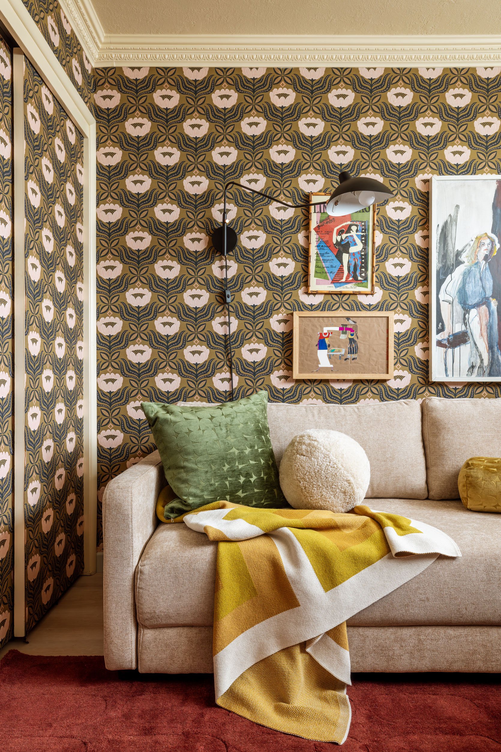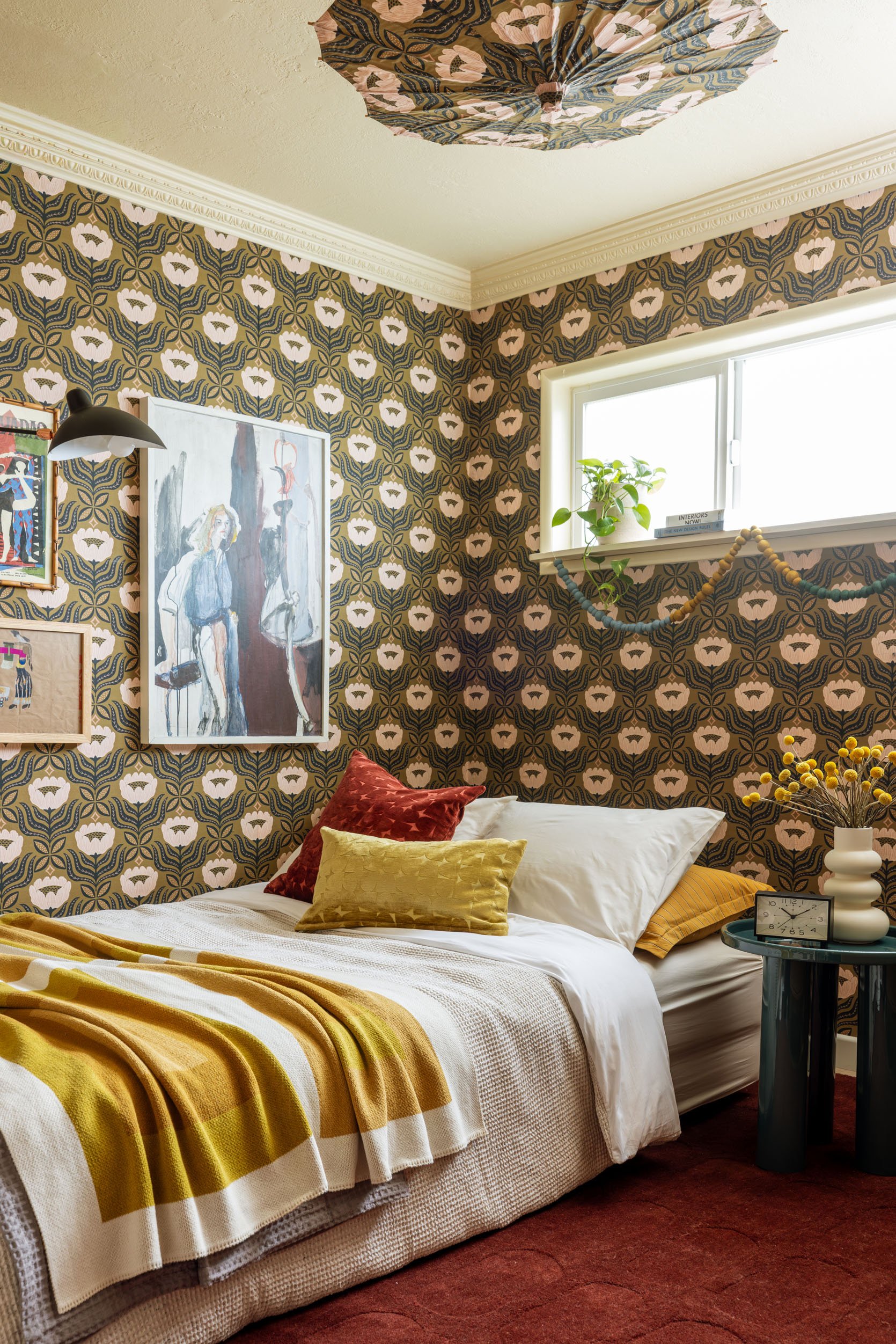 Above all, I was craving a second sleeping zone that felt comfortable and spacious. A tucked-away oasis for any friend, parent, or first-date-mistake to have a place to crash for the night. A room that felt…roomy, despite its humble footprint. A private hang-out spot that could transform for guests but would still inspire me creatively anytime I needed to dig in the closet for art supplies. This old “wallfabric” isn’t coming down anytime soon, but with a hefty dose of some AllModern magic, I think we gave this familiar space a brand new feel…