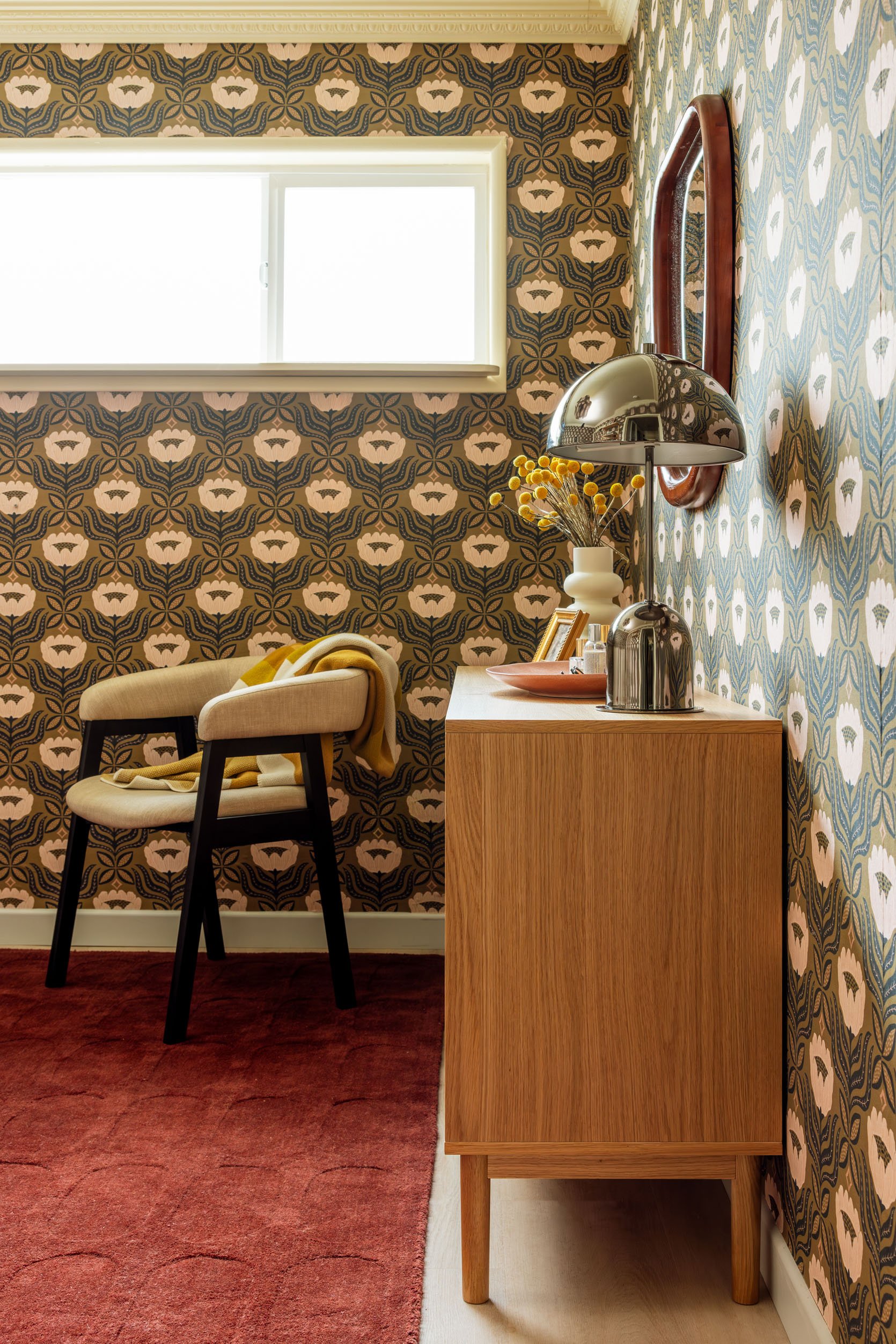 One element I wanted right from the jump was a big hit of red. I knew this would help guide the design in a fresh direction. I envisioned a simple but interesting color-drenched rug, and it wasn’t hard to find a winner–I felt great about this one instantly! I love how its subtle, indented pattern references a similar repeat on the wallpaper, and I think the deep red color solidly anchors the space, don’t you?