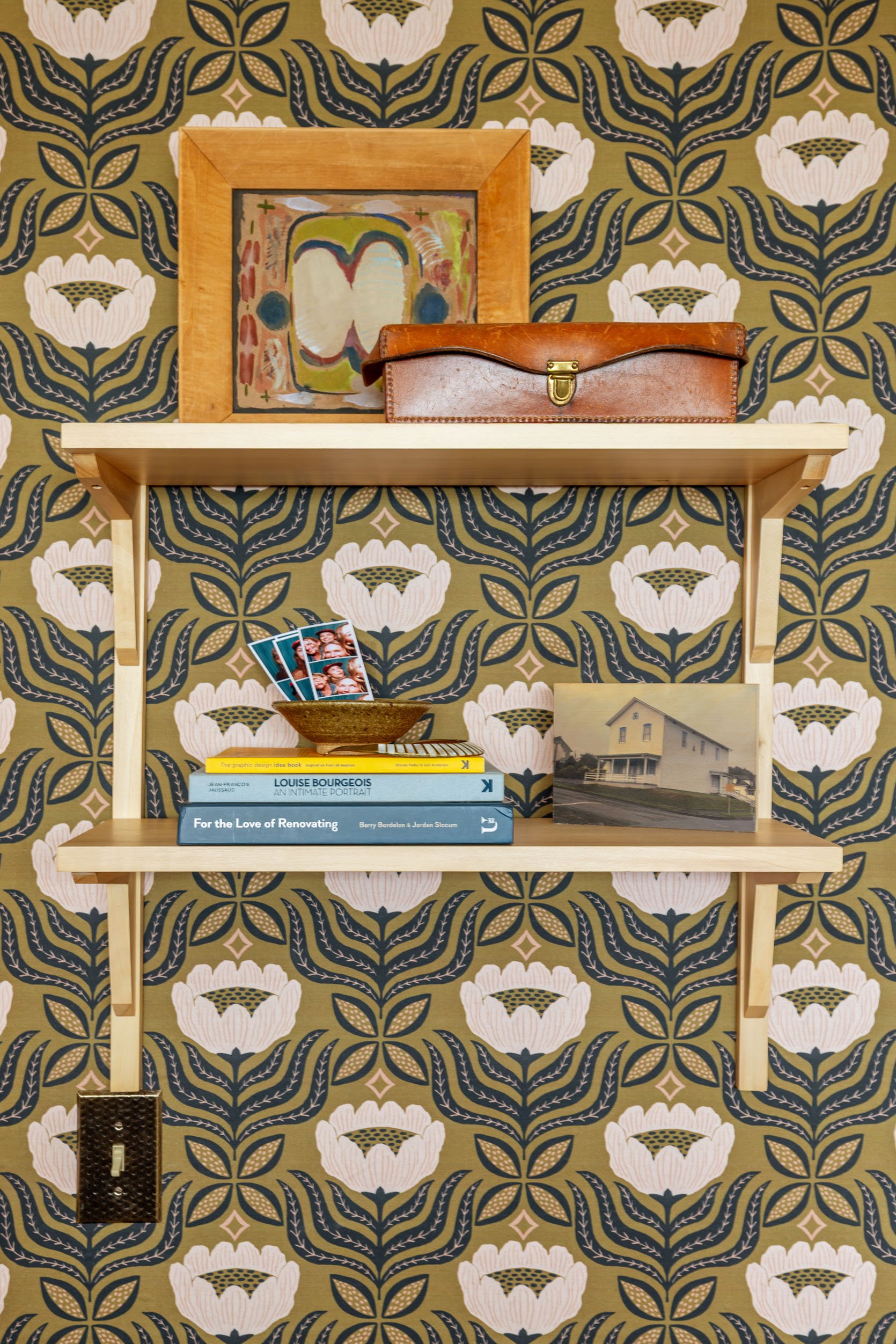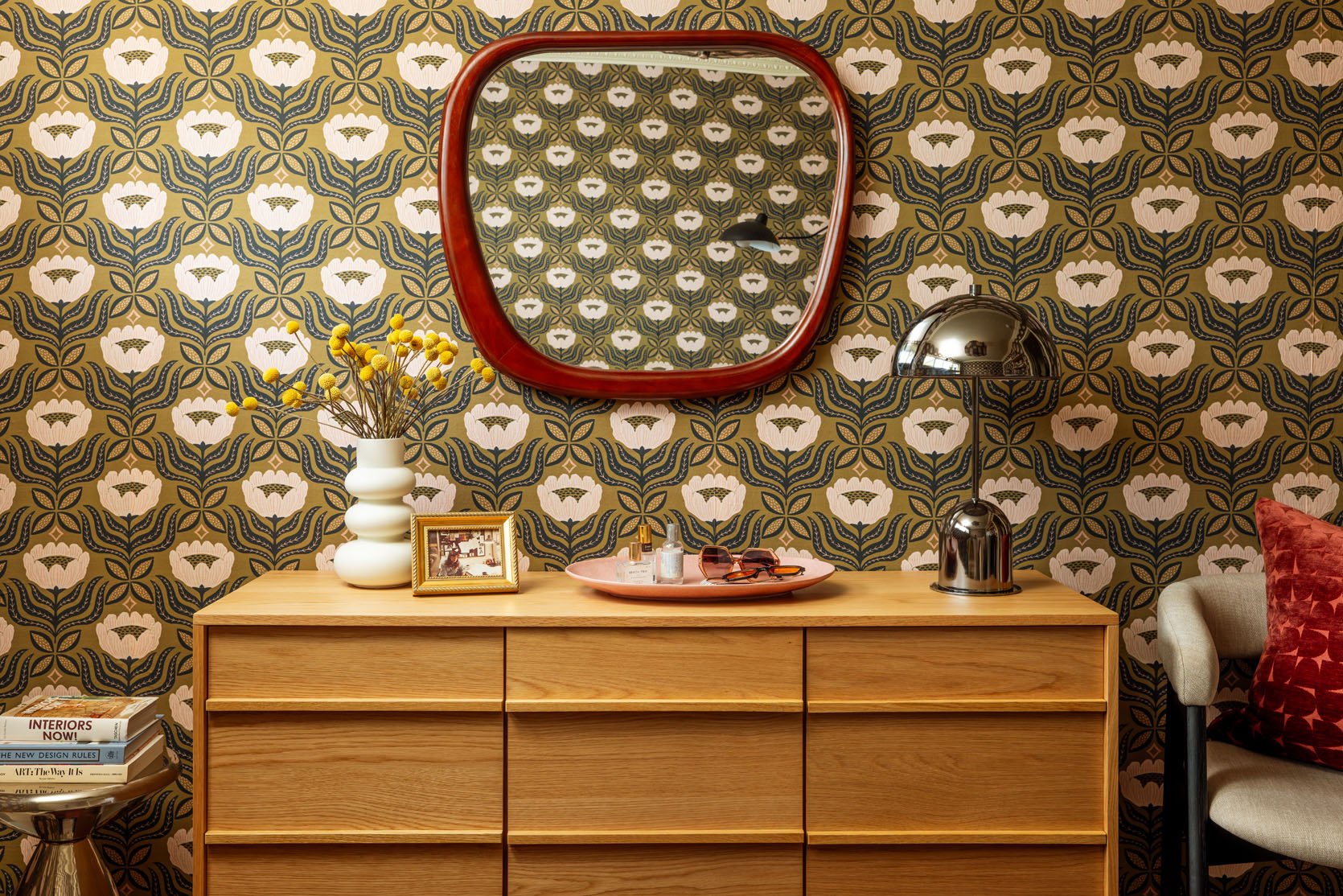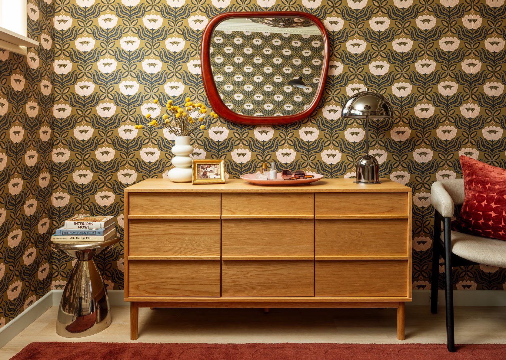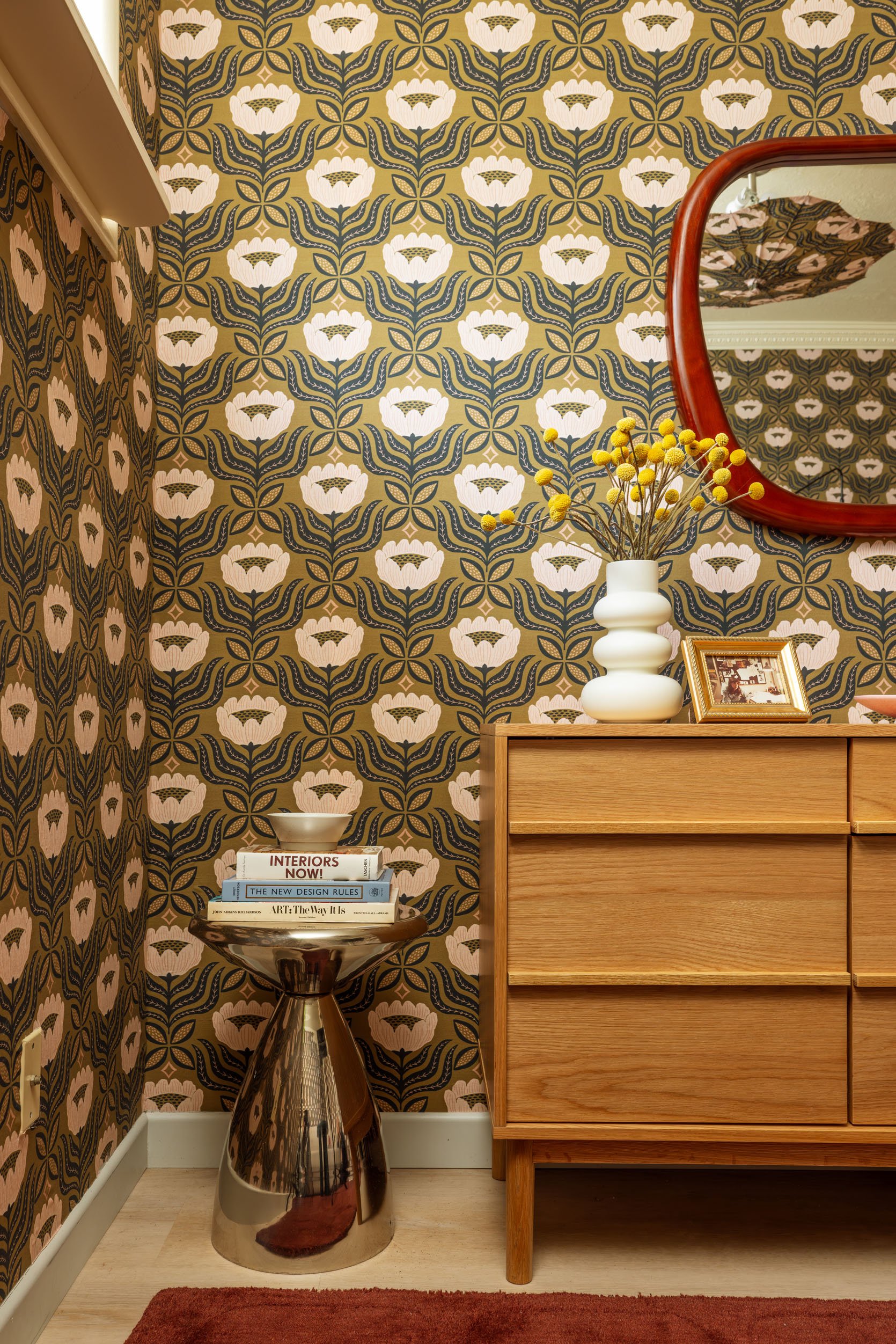 The little metal side table in the corner was a last-minute addition (eventually, a tall, spiky plant or narrow bookshelf might live here instead), but I love what these balanced pops of chrome add to the space. The platter sitting on the cabinet works great as a catchall, and the pink matches the flowers on the wall, but when visitors come to stay, I’ll likely clear the surface so they can use it to spread out and unpack. However, one MUST leave out a design-forward vase of flowers to properly greet your guests upon arrival!