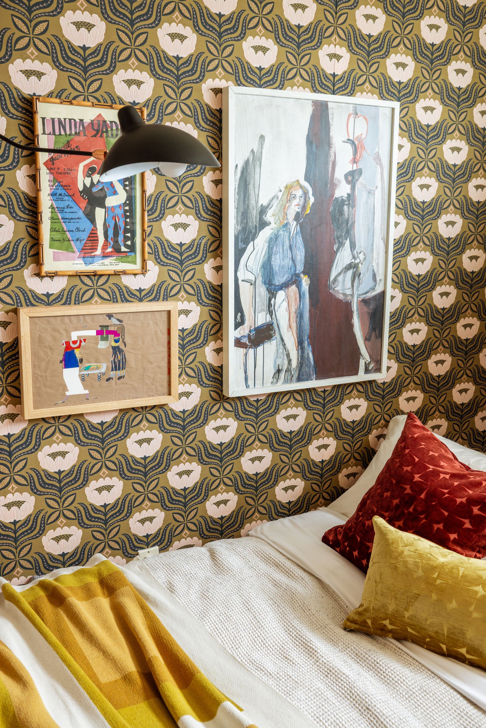 We filled out the opposite wall with a few of my favorite artworks. The large painting is a piece my mom’s college classmate painted for her that I, yes, STOLE and refuse to give back. The bamboo-framed dancer print is one I scored years ago at a local Latvian rummage sale for just $10. And the newest addition is a piece Em commissioned for all of us by one of our favorite local artists, Purl. At our last team retreat, she surprised us each with a custom art piece for our birthdays. Mine is titled “Shopkeepers”. It was the final piece needed for this little gallery wall, which I think hangs so nicely over both the bed and the sofa. I didn’t even have to move the old swing arm sconce from my last makeover!