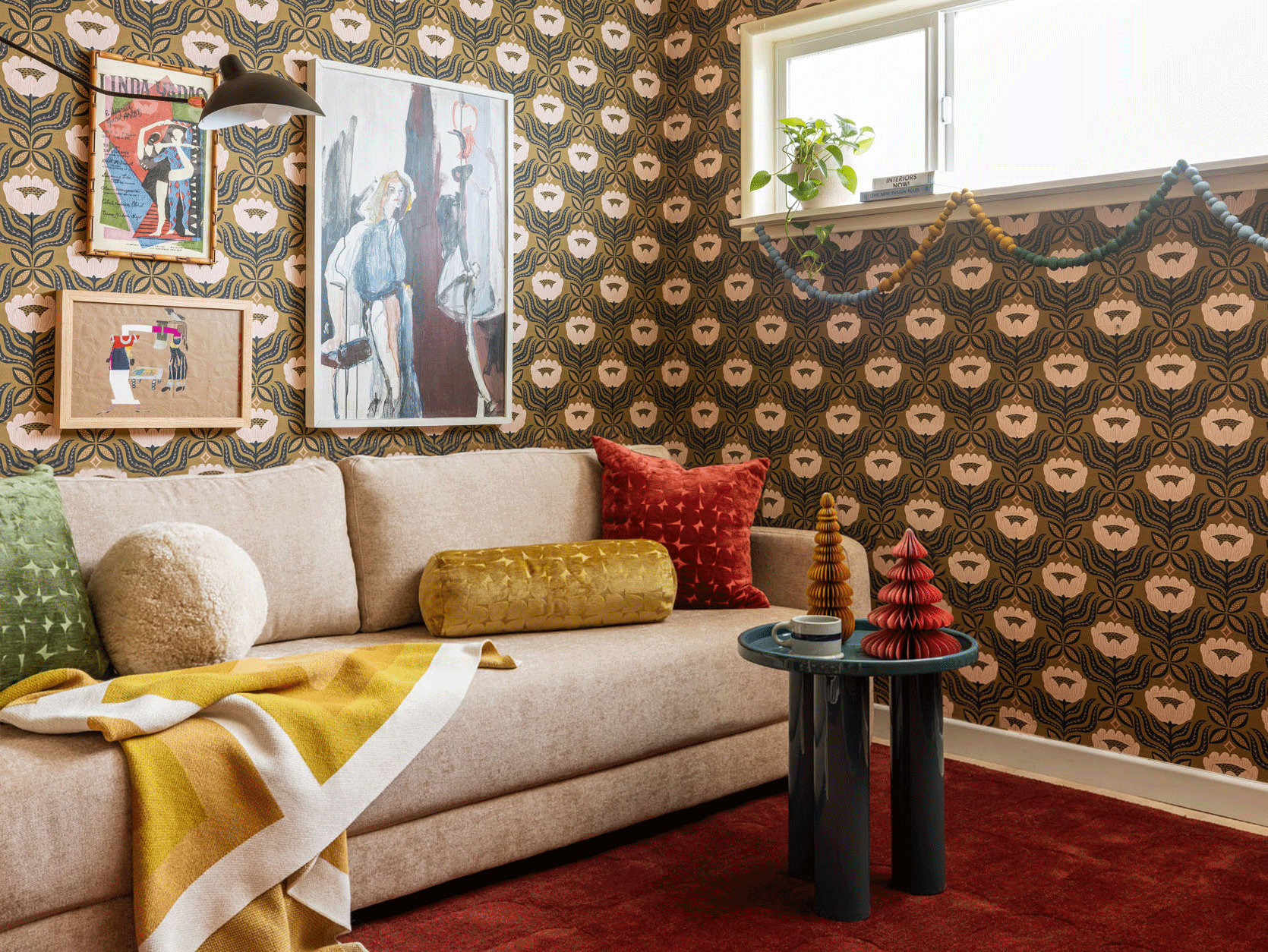You may recognize some of the styling elements (like the throw pillows, side table, chrome lamp, upholstered chair, or paper trees) from our recent Christmas at The Carly decoration transformation. And well, that’s because I stole them for myself after the shoot. Actually, Em asked me to do a chunk of the shopping for that first holiday photoshoot, and instinctively, I pulled pieces from AllModern that I thought might also work in my space, hoping to cut down on the amount we’d need to style out both. I picked colors and textures I liked and could utilize here as well, so it’d make sense for me to just keep most of it in the end. Just some light, premeditated “stealing”. Like, I’m sorry, but I really wanted some of those jewel-toned paper trees for myself. This is meant to be a holiday guest story after all!