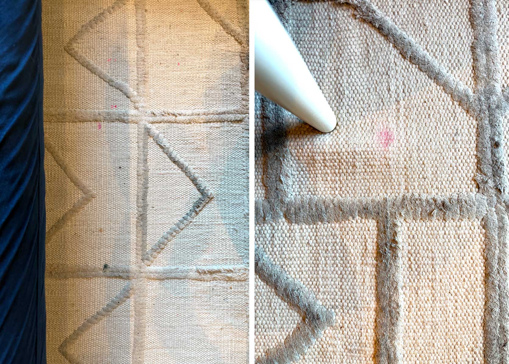 Here is exhibit one and two of a freshly vacuumed rug. You may THINK it needs a cleaning, but this IS it clean. Dot markers simply do not come off a rug of this material. Not with an upholstery cleaning machine, not with Folex (though it does work wonders on many other things), not with elbow grease and some prayer chants. Play-Doh and kinetic sand that you didn’t realize was already smooshed into all the fibers, then dried up before you could get around to it? Those don’t come out, either. My wool rug in the kitchen that has *seen things*? It’s doing great, with barely any battle wounds.