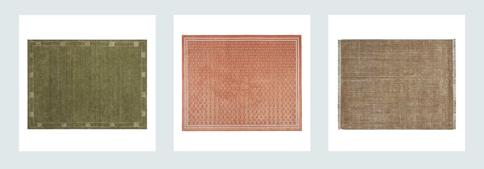 From Left: Pierce & Ward Deco Border Handwoven Wool Rug | Via Machine Washable Rug | Prism Handwoven Performance Rug