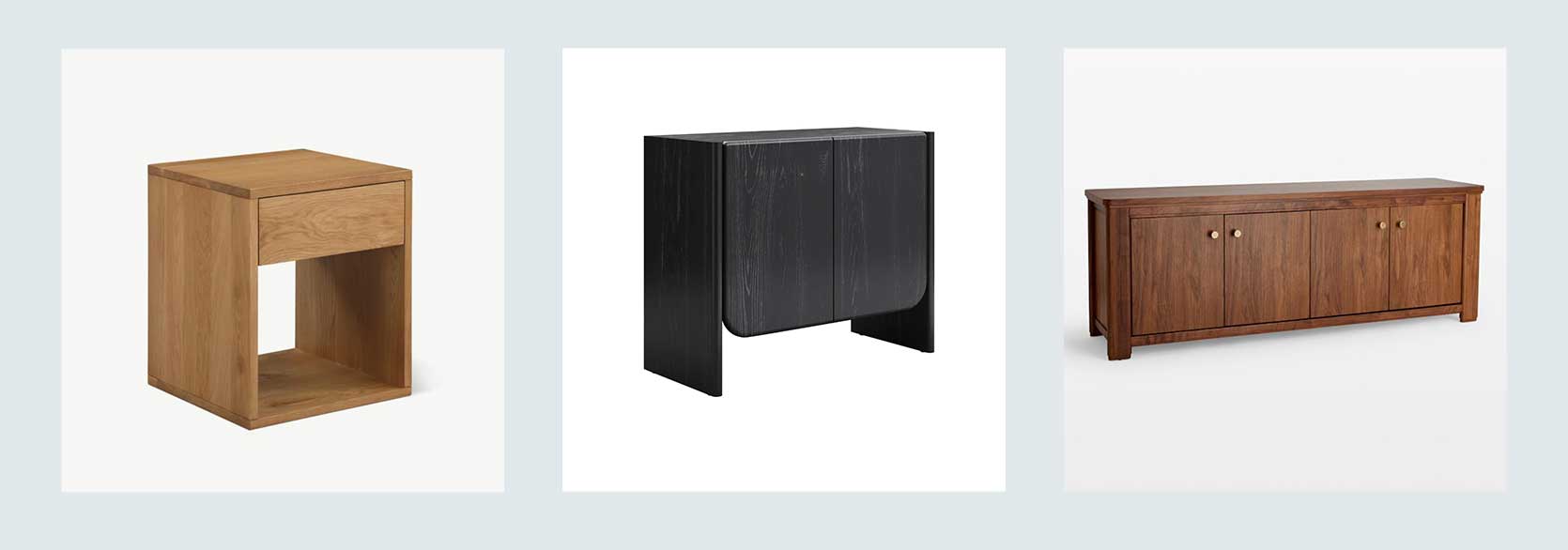 From Left: Rest Easy Nightstand With Drawer | Mid Century Modern Wood Curio Cabinet Black Oak | Anders Media Console, 72″ in Walnut