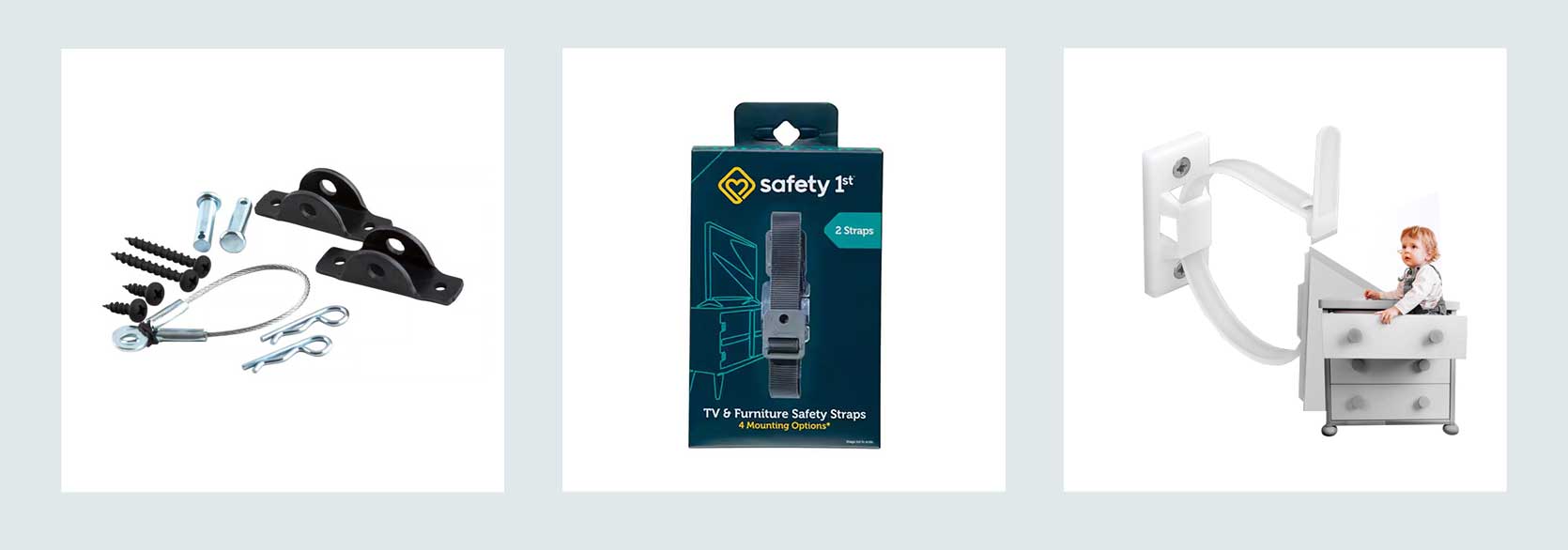 From Left: Hangman Black Furniture Anti-Tip Kit 400 lb 1 pk | TV & Furniture Safety Straps | 4our Kiddies Furniture Straps (10 Pack) Baby Proofing Anti Tip Furniture Anchors Kit