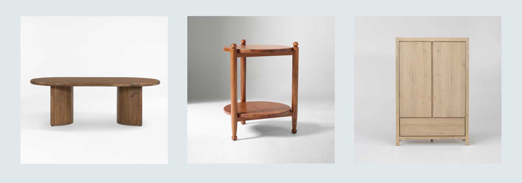 From Left: Panos Brown Solid Acacia Wood 51″ Oval Coffee Table | Pierce & Ward Wood Tiered Side Table (18″) | Voyage Natural 2-Door 3-Drawer Bedroom Armoire Closet By Nate Berkus + Jeremiah Brent