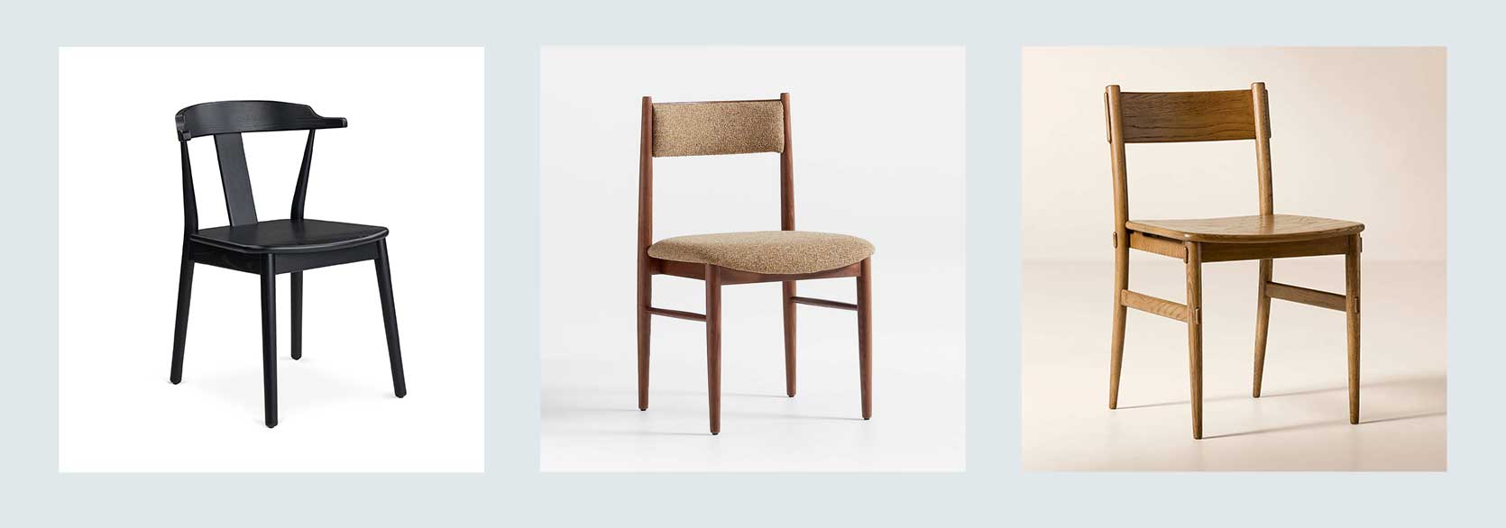 From Left: Morton Dining Chair – Black | Petrie Barley Ash Mustard Upholstered Dining Chair with Performance Fabric | Merritt Oak Dining Chair