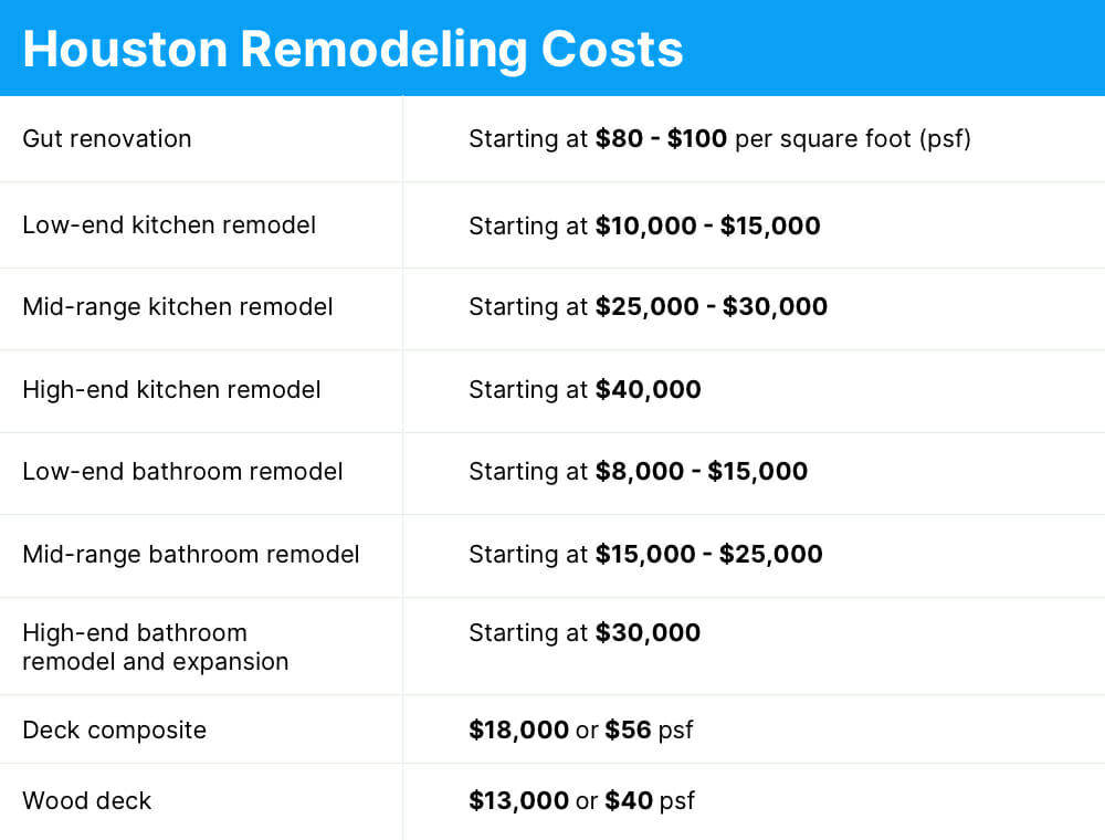 Remodeling costs for a total gut renovation in Houston starts at $80 – $100 per square foot (psf) for a project that uses affordable finishes according to Houston-based Sweeten contractor Santiago And Lorella B. This means materials such as laminate flooring and countertops, value-brand appliances, and basic tiles from big box stores like Home Depot.