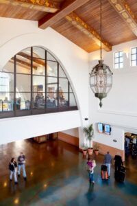 Preserving the “Santa Barbara airport experience” was official policy for the small Santa Barbara Municipal Airport when building the new 72,000 foot terminal building. The new terminal was designed to look old and in line with the predominant Spanish Colonial Revival architecture of the city. The design incorporates established style features—white stucco walls and red tile roofs with accents in wrought iron, decorative tile, stenciled wood beams and, of course, traditional steel windows.