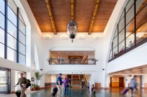 In addition to the architectural aesthetic, the “Santa Barbara Airport experience” also means preserving open-air features that passengers have enjoyed for decades. Natural light, ample ventilation, lush landscaping and scenic views help achieve a connection between indoors and out. A ground-floor observation deck, surrounded by Hope’s custom steel wind screens, was added to provide a place for the public to take in the scenery and watch airplanes arrive, just as they did before.