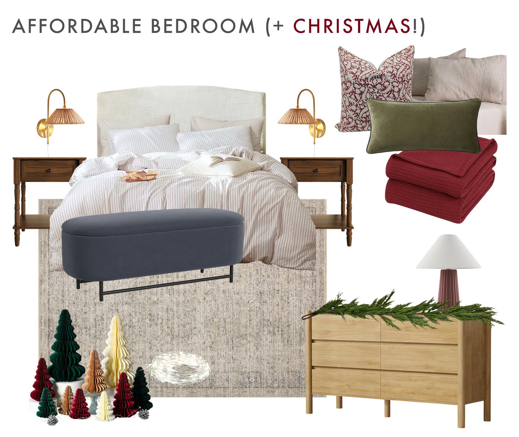 Bed | Nightstand | Sconce | Striped Bedding Set | Storage Bench | Rug | Paper Christmas Trees (Set of 3) | Fairy Lights | Dresser | Faux Garland | Table Lamp | Block Print Pillow | Sheet Set | Green Lumbar Pillow | Throw Blanket
