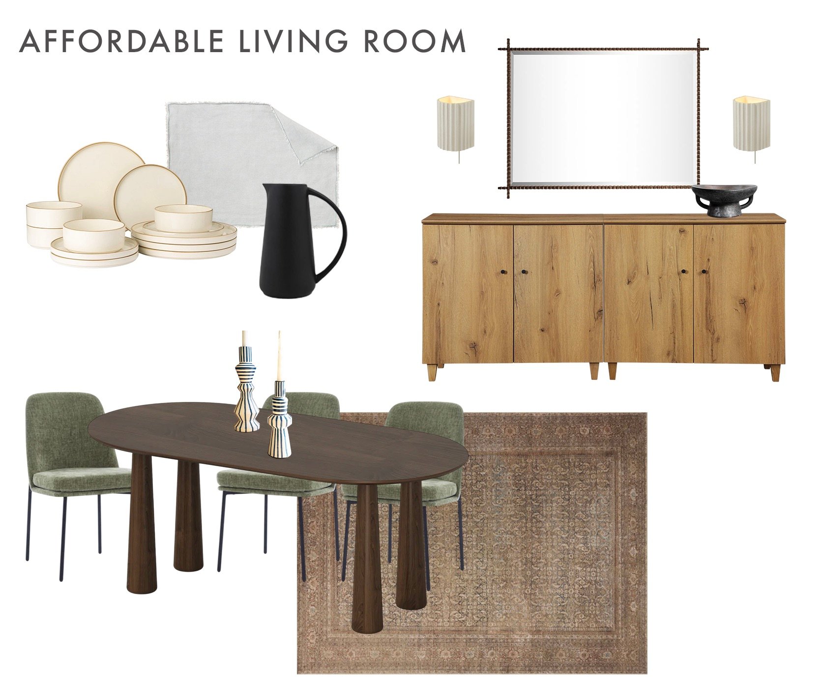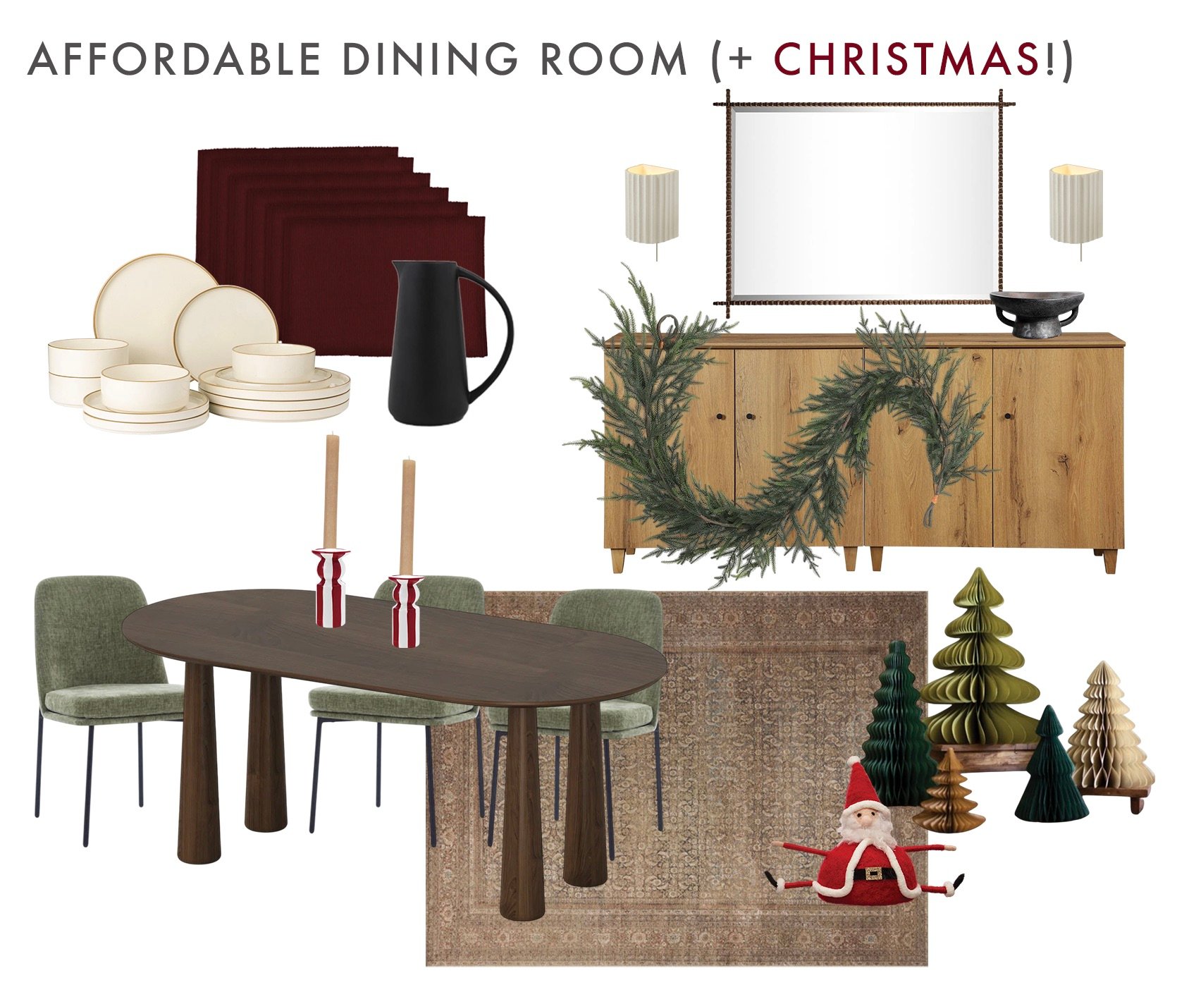 Here is my organic, modern-with-a-twist dining room set up. The table was the first pick. I wanted something that felt fresh but not so trendy that in a few years you’d get really over it. This one fit that bill! There are also two size options – 6-seater and 8-seater. Chairs were the next hurdle, but I quickly found these. The green is a great neutral for everyday life and especially appropriate for Christmas;) I also know how deeply Em feels about dining upholstered chairs being the ideal choice for long dinners. The reviews confirm that these babies are most definitely comfortable. Now, I know rugs under dining tables is a divisive topic, but I wanted to give an opinion for those who are pro! I think this colorway is great for…a little mess, and I loved the style contrast to the more modern furniture. Oh, and the candlestick holders too! The modern abstract look of those mixed with the traditional pattern of the rug just felt good and eclectic to me. Moving onto the credenza. This is UNDER $300 and beautiful. I clearly have a thing for slightly rustic-looking wood grain. But then, to modernize, I loved that bronze-framed mirror and those textured ceramic scones. They are plug-ins, so no need for a junction box:) Also, how good is that footed bowl?! To then play off the bowl, I found that great black pitcher (perfect for water, as a vase, or a delicious cocktail;)). Finally, I’m sure most of you have dinnerware, but in case you didn’t, I love this modern organic set. It’s such a great price for the full set. If you are a placemat person, these frayed-edged, linen ones are extremely pretty and chic. Are you ready for our Christmas feast?