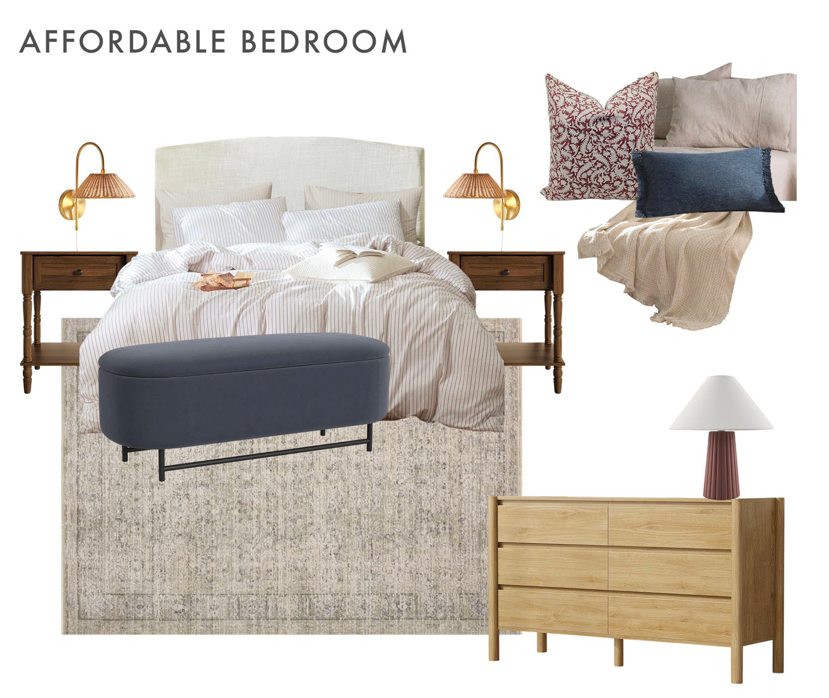 Bed | Nightstand | Sconce | Striped Bedding Set | Storage Bench | Rug | Dresser | Table Lamp | Block Print Pillow | Sheet Set | Blue Lumbar Pillow | Throw Blanket