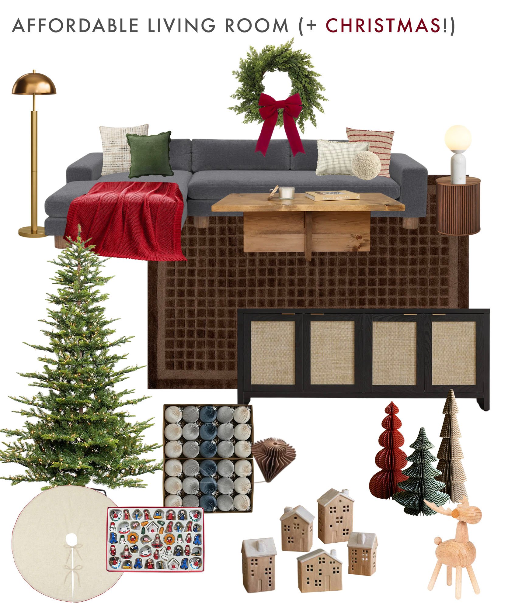 Welcome to my rich, organic, and yet effortless living room. I started out with our charcoal Milo sectional because I know gray feels like a “safe” color to choose, and this one is so beautiful in person. I also chose a sectional for more seating/lounge potential. The Milo also comes in a sofa if you love it, but don’t have space for a full sectional:) But to bring in the warmth (and avoid a cold gray space), I chose this awesome chocolate brown rug. The pattern is modern but equally as versatile. The coffee table is solid wood and BEAUTIFUL. I’m pretty sure we included it in our “Best Affordable Furniture of 2025” post, too. When a piece is this pretty, it needs to be celebrated more than once. I then chose a round side table in a darker wood tone to keep things interesting and to offset all of the rectangular shapes. Also, notice that two pieces have feet/open space under them (sectional and media center), and the coffee table and side table are flush to the ground. Remember to have a balance of that kind of visual weight. Your eyes will thank you. Speaking of balance, since there are so many dark colors, I chose that credenza because of the woven door panels. It’s an added texture and brings in some lightness. The same goes for the lamps! The brass floor lamp is bright (and a little metallic always helps a room shine), and the table lamp is white and will give off that beautiful soft ambiance glow. Lastly, for the pillows and throw, I wanted a mix of light tones, color, and pattern. Burgundy is still so on trend, but still a classic, making it a color I knew I wanted to include. Plus, most of those pillows are from the Chris Loves Julia x Loloi line, and boy, are they good. Em used a bunch of them in the river house, so we know for a fact they are EHD-approved:) Now, let’s deck this room out for Christmas…