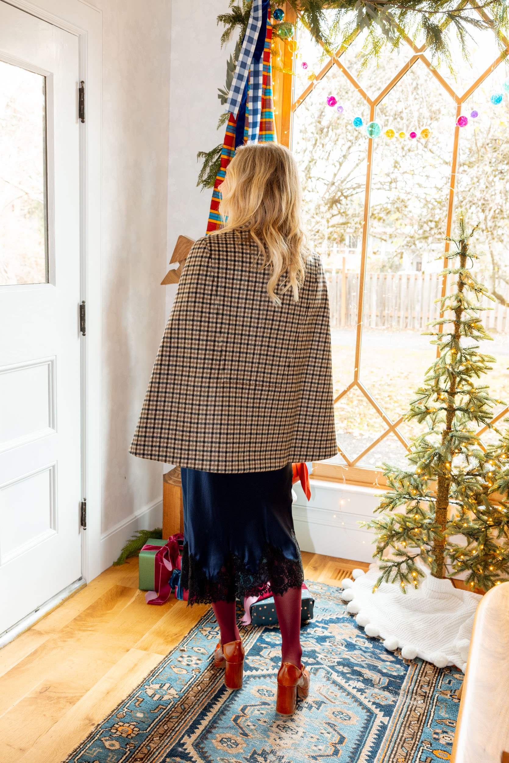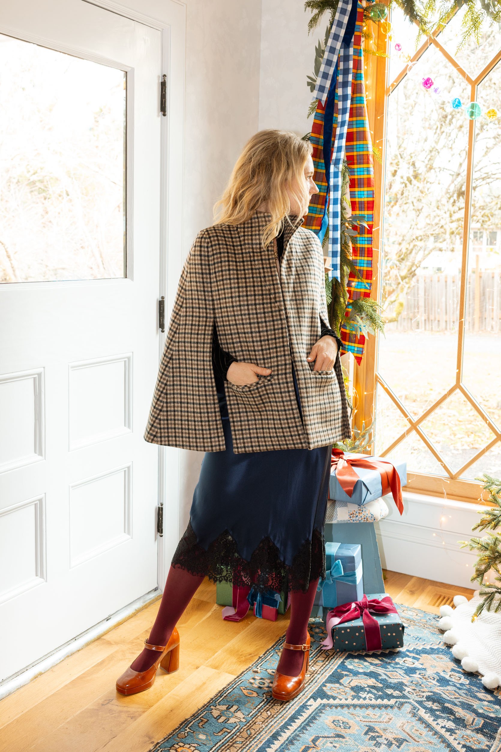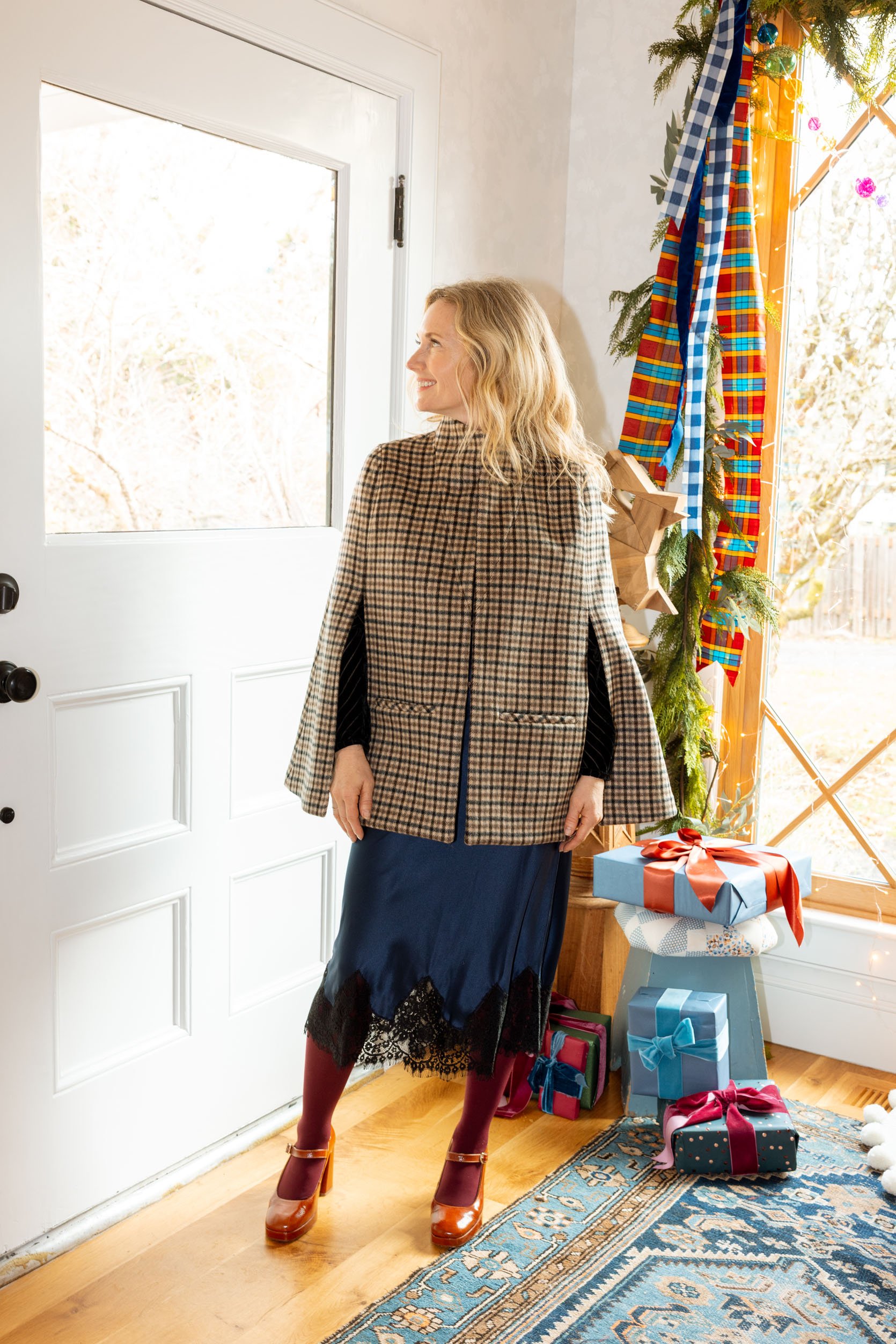 Here she is, super sophisticated! A new company named Alice Walk reached out to send a few things with no obligation. Usually, I decline, not wanting more stuff I might not wear. But this cape is so beautiful that I wanted to see it in person – and it’s extremely well-made and pretty. It comes in a few solid colors as well, but of course, I was drawn to this pattern. It’s definitely splurgy (think Frank & Eileen vibes), but for someone with an office job that wants to impress, I think this is fantastic to wear around a city.