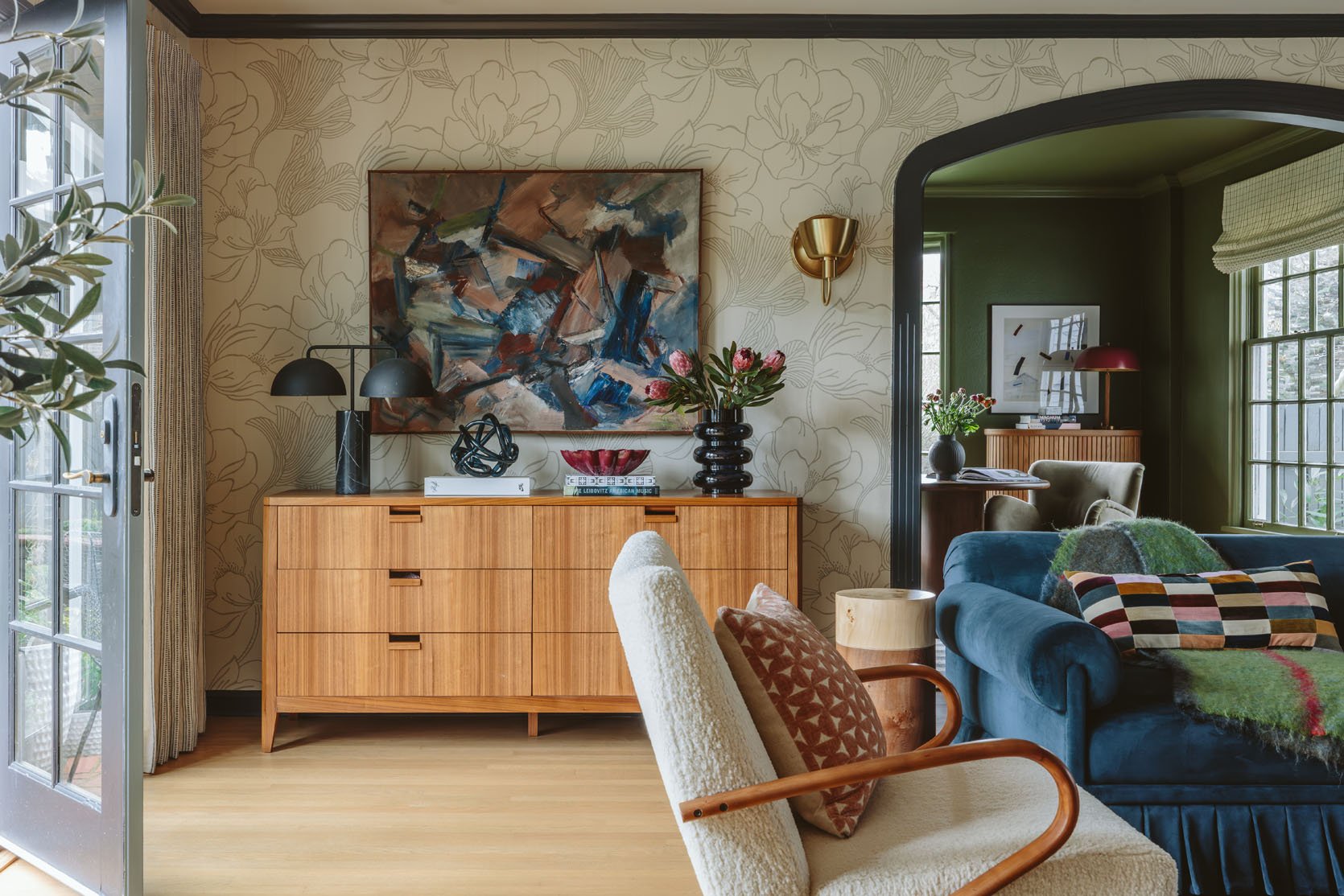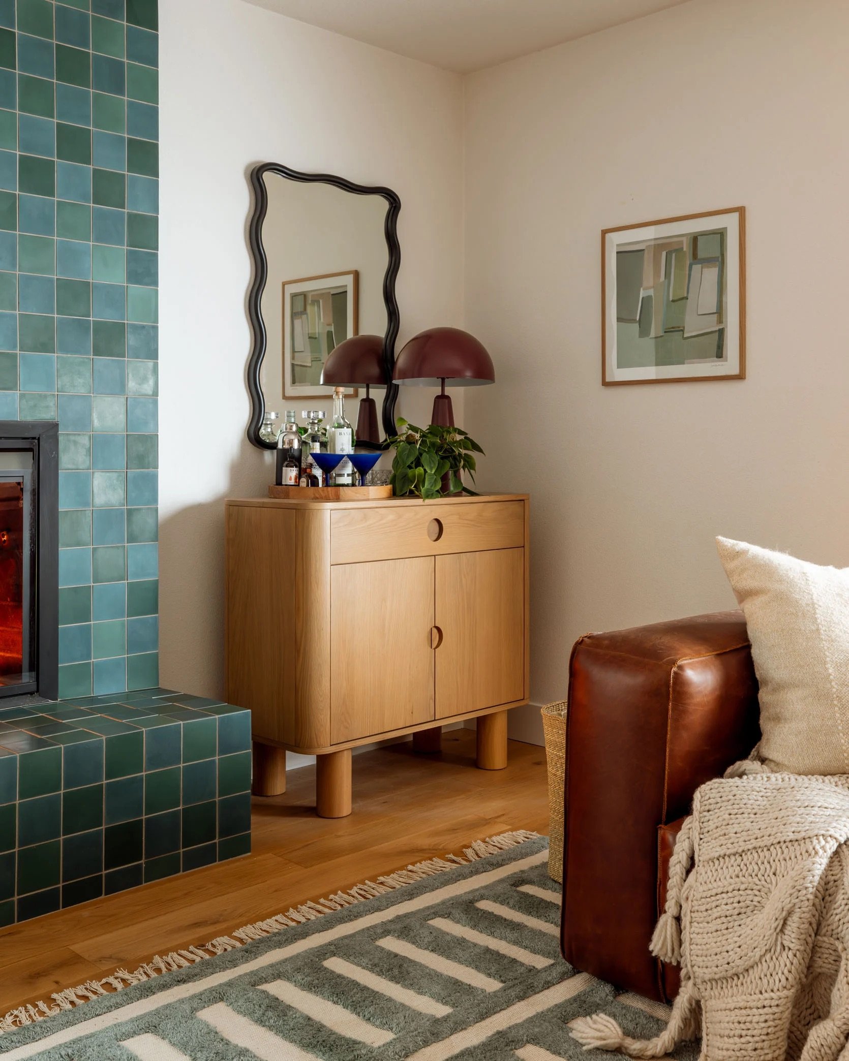 I wanted to zoom in on her bar cabinet to show that even this piece has a little room from the wall:) Every piece breathes, which creates the illusion of more space.