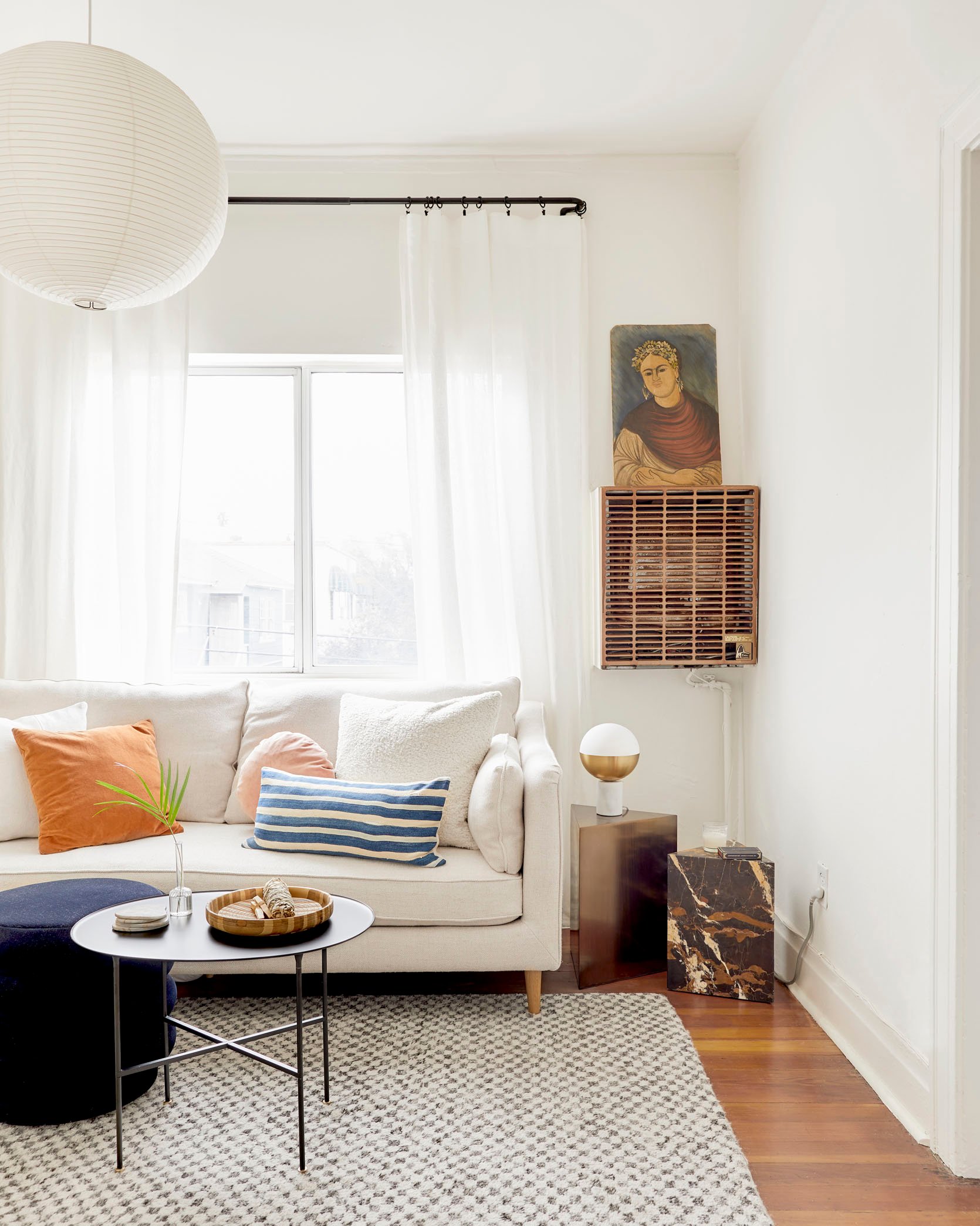 Don’t automatically get the smallest-sized furniture for a small space. It may seem counterintuitive, but typically, choosing “normal-sized” furniture pieces will make your space feel intentional and not truncated. Of course, there’s a balance, right? For my current living room sofa, I chose the 84″ size. There was a 72″, but I felt it would have looked too small. Would I have more “space” with those 12″? Yes. But not in a good way. And had I chosen a big sectional, that clearly would have been too much. This piece of advice was also something that Nate Berkus said in the video I saw a couple of years ago, so if you don’t trust me, trust Nate.