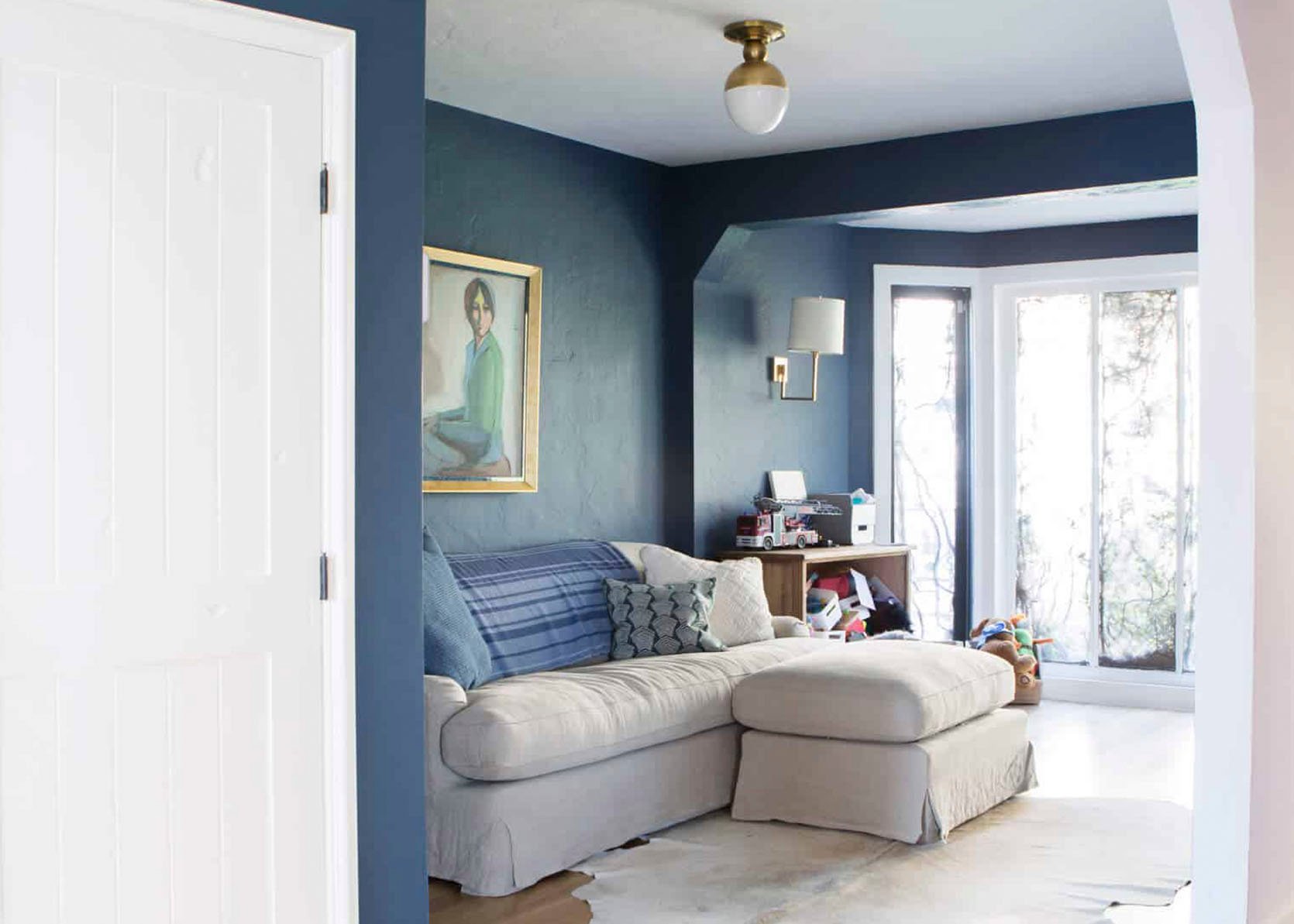 This is Emily’s old family/playroom in Los Angeles for those who are newer here. Em really wanted to make the room feel cozy, and as most of you know, she’s the #1 fan of the color blue…so she chose that really pretty blue for the room initially. But there was too much light coming through those front windows and from the other parts of the house. So while she wanted cozy, it really cut off the space from the rest of the house, made it feel small in a not-so-great way, and didn’t read how she wanted with all that light coming in. She regrouped, went with a happy white (and a cool mural), and viola! A bright, happy room that feels SO much bigger and blends better with the other rooms it’s attached to:)