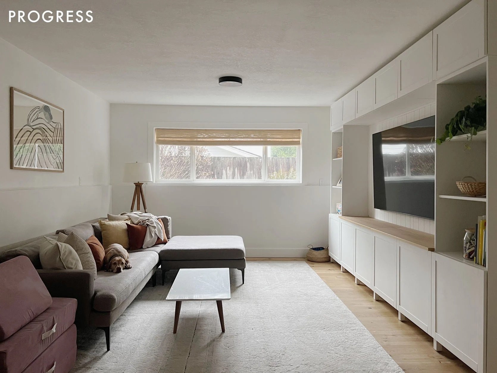 My last example is Kaitlin’s basement/office. First off, do we see how much better this low-light room looks painted dark?? Exactly. But I’m here to talk about furniture scale. In the “progress” photo, the furniture scales aren’t balanced with each other. But when the sectional and flushmount got bigger in the new version, and the wall cabinet smaller, it all feels so much more open and larger.