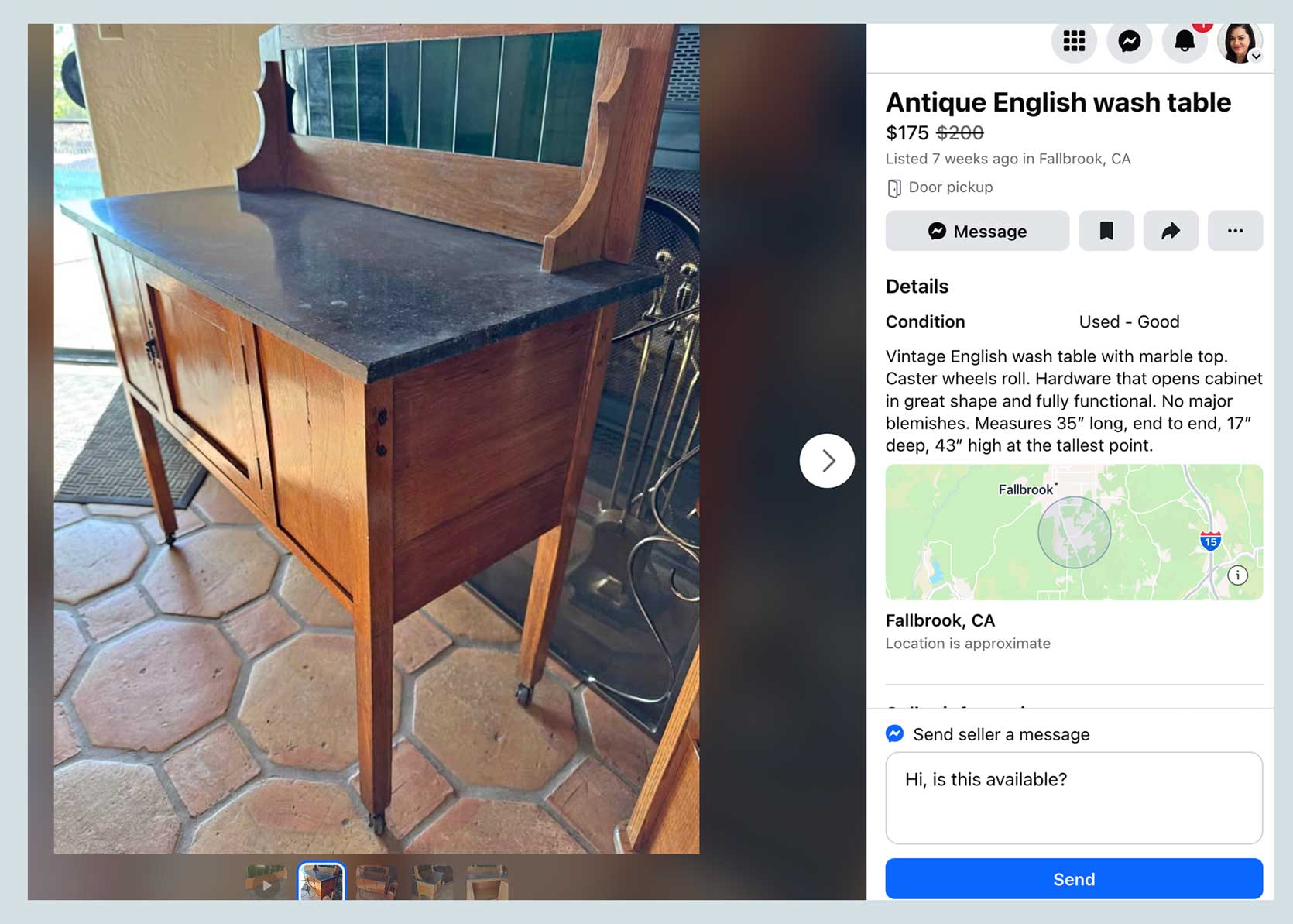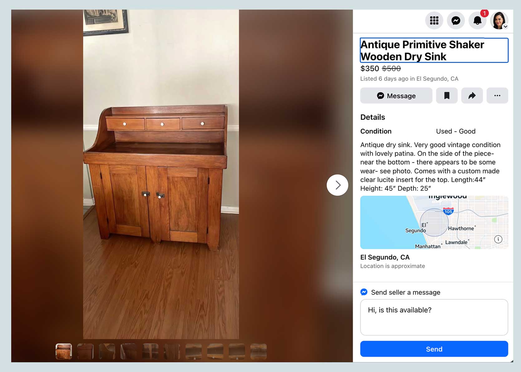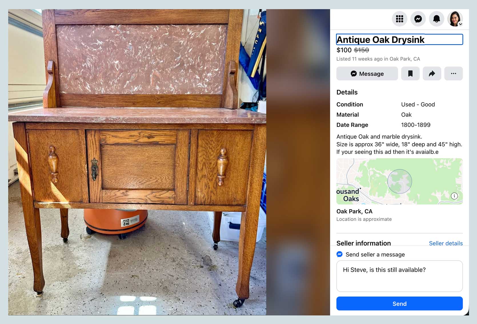 As I learned from the comment section of my first article about barrister bookcases, prices vary widely on secondhand items sold on local marketplaces, depending on where you are. Perhaps it’s supply and demand. Or maybe it’s simply different inventory in different parts of the country. But regardless, I wanted to walk through some of the dry sinks I found within 50 miles of me here in Los Angeles.