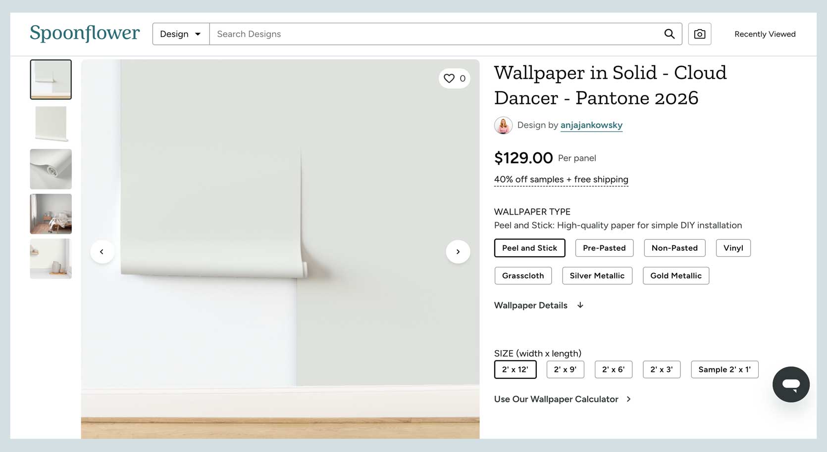Does it make for exciting product releases? Absolutely not. Some of them are maddeningly mind-numbing, such as the Cloud Dancer white wallpaper—pictured being applied on top of a white wall—from an artist on Spoonflower. In previous years, the brand released very fun prints in partnership with the color authority (here is last year’s); this year? Nothing officially, just whatever the third-party artists have done themselves…and I don’t blame them. As a design editor, my inbox is always jammed with outreach by PR people sharing products from their clients in shades similar to the COTY, hoping I include them in a roundup about the announcement. This year, I got two messages. TWO. Talk about a blank slate….for my Gmail account. It quieted the noise in that sense, that’s for sure.