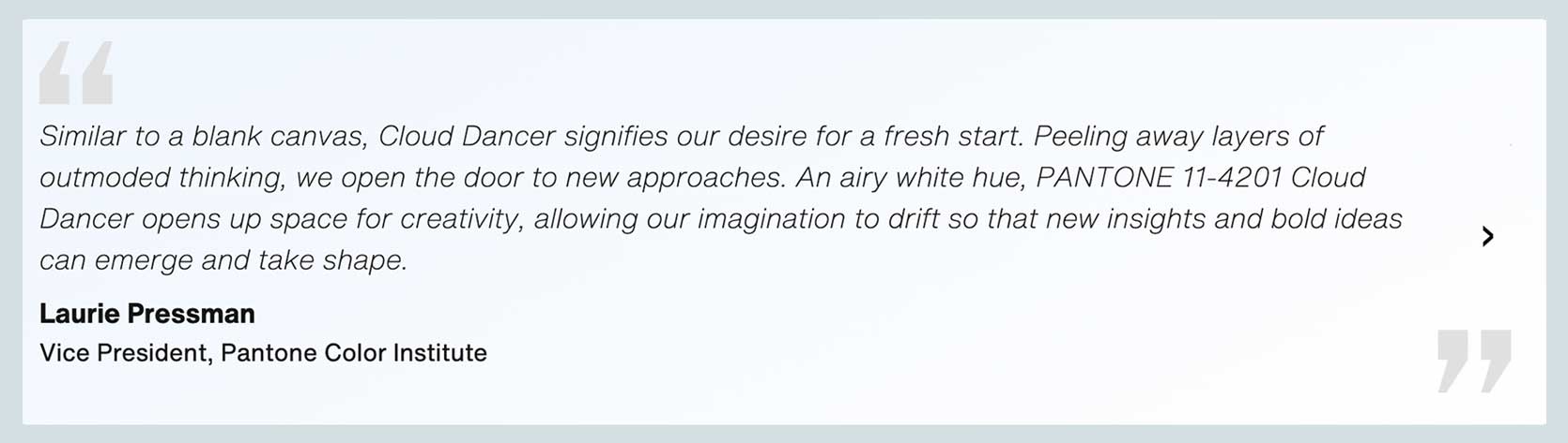 PANTONE 11-4201 Cloud Dancer to be exact: “A lofty white that serves as a symbol of calming influence in a society rediscovering the value of quiet reflection.” Hmm…interesting choice of words.